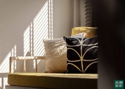 Customized extra tall lattice screens in the living room acts as a partition, creaing a workdesk area. We sourced for old carvings to use as the middle inserts to make them more unique.