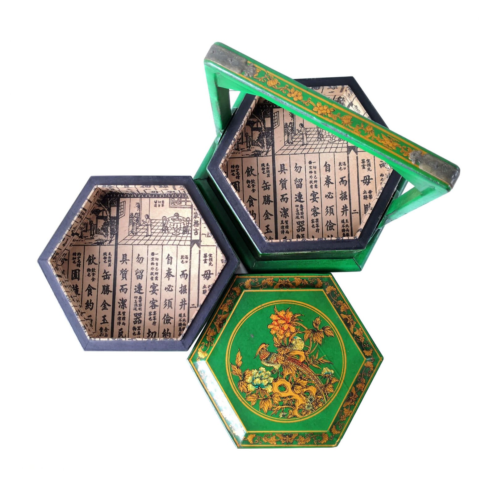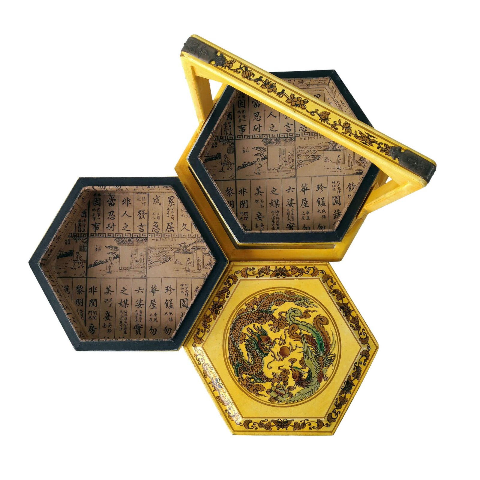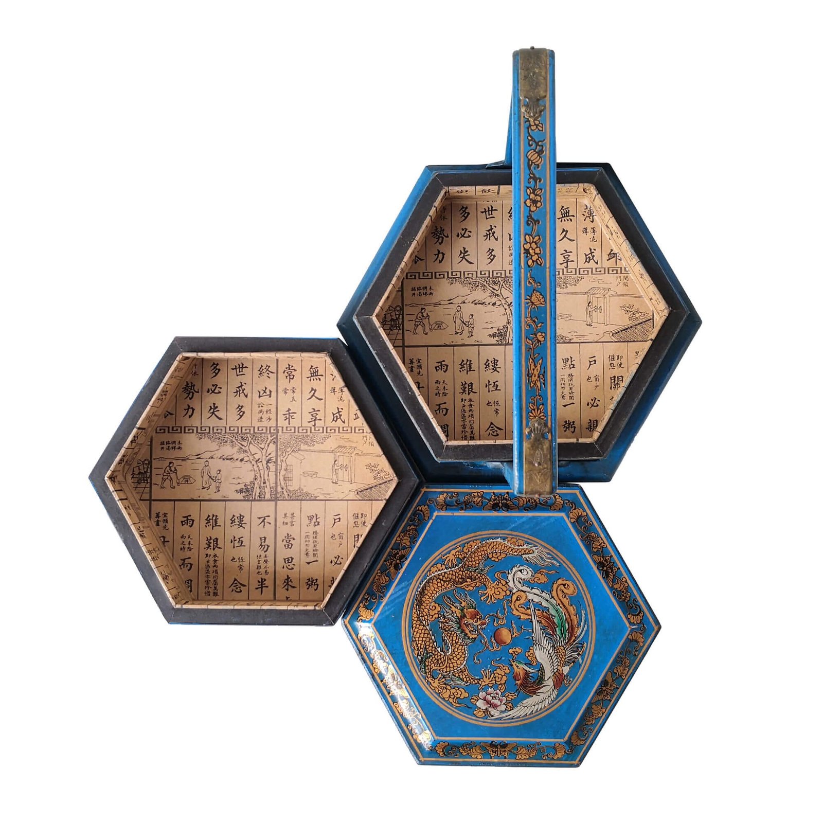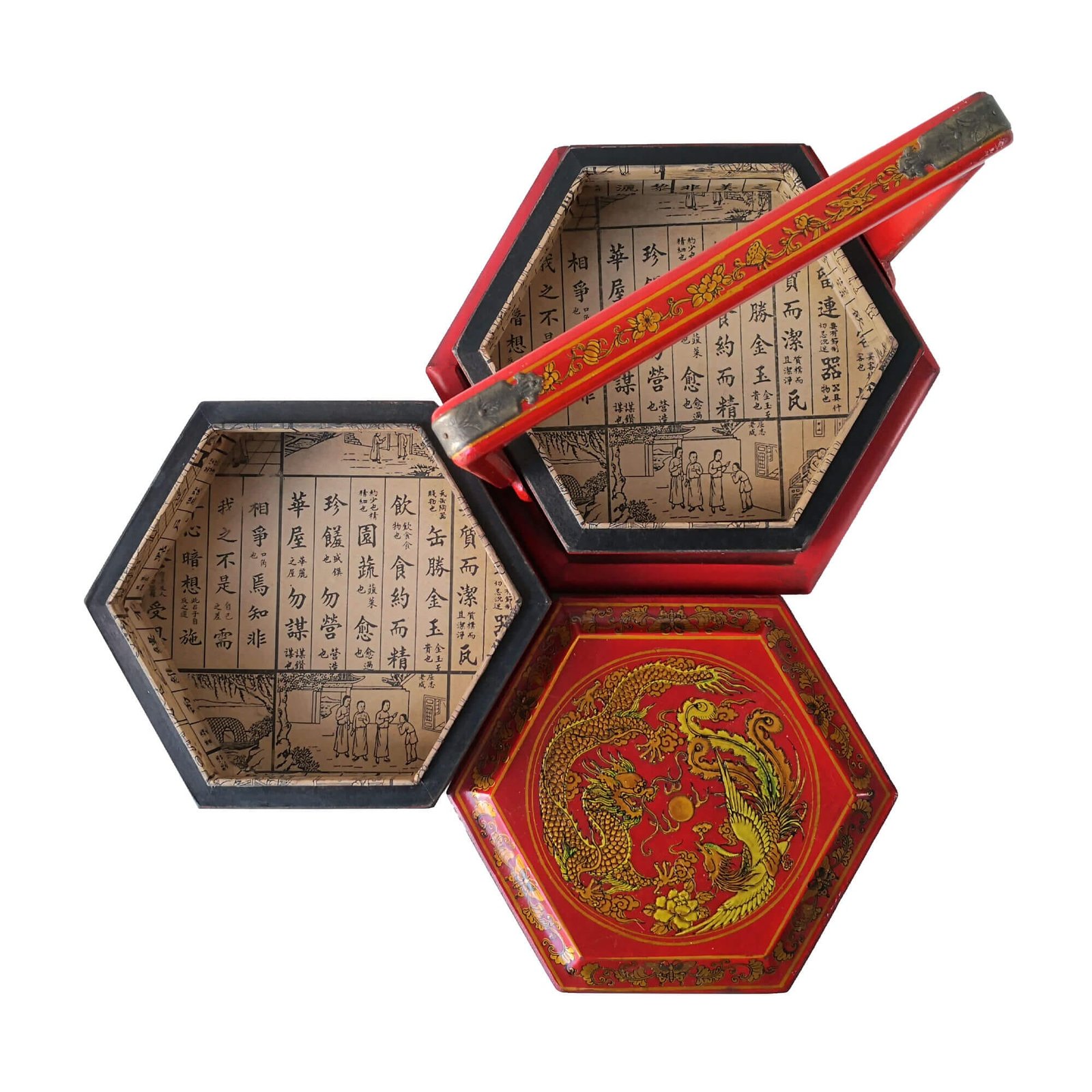 Mini 6-sided 2-tier carrier box covered with faux leather decorated with gold paintings, the inside is lined with prints of old chinese literature. L28 x W24 x H25cm.
