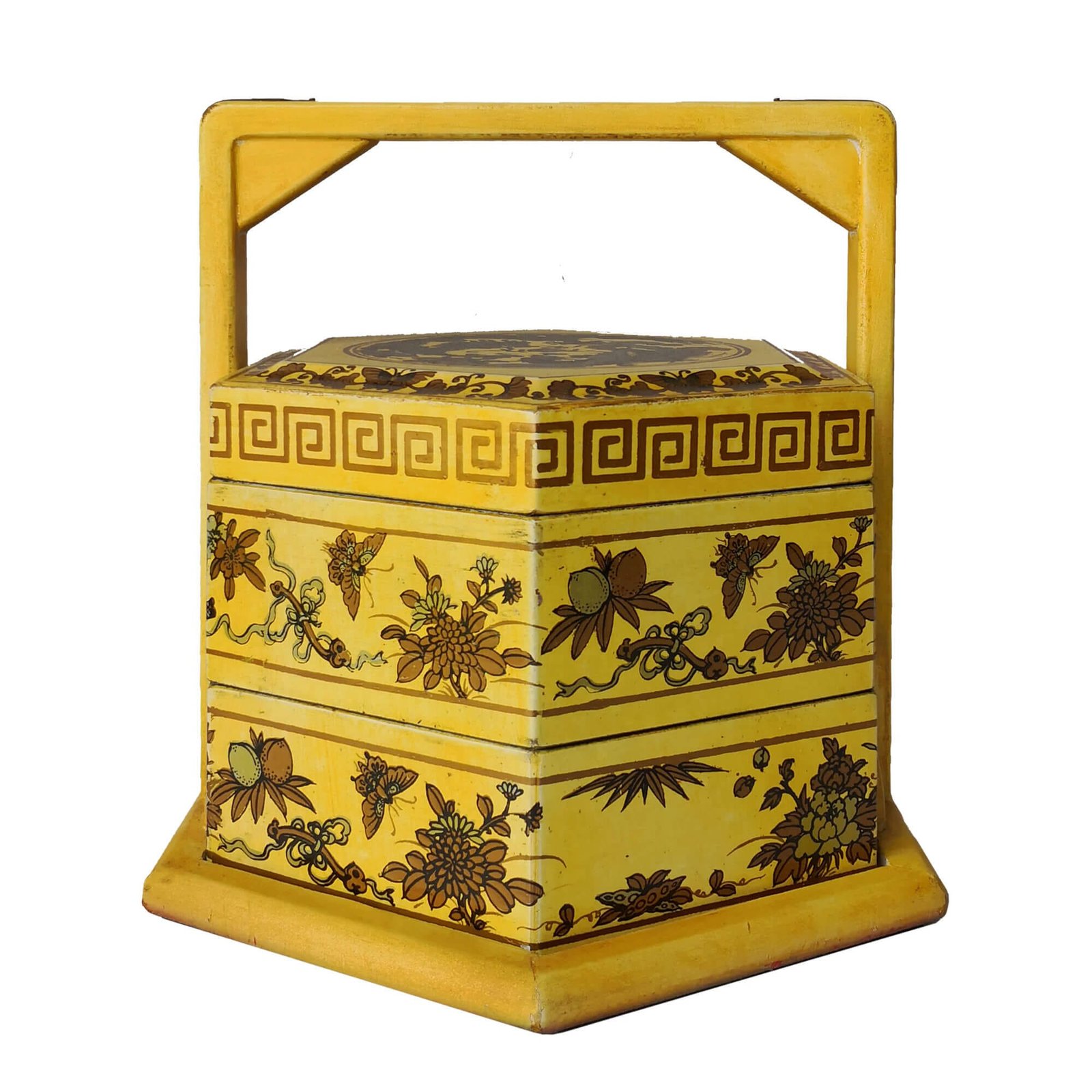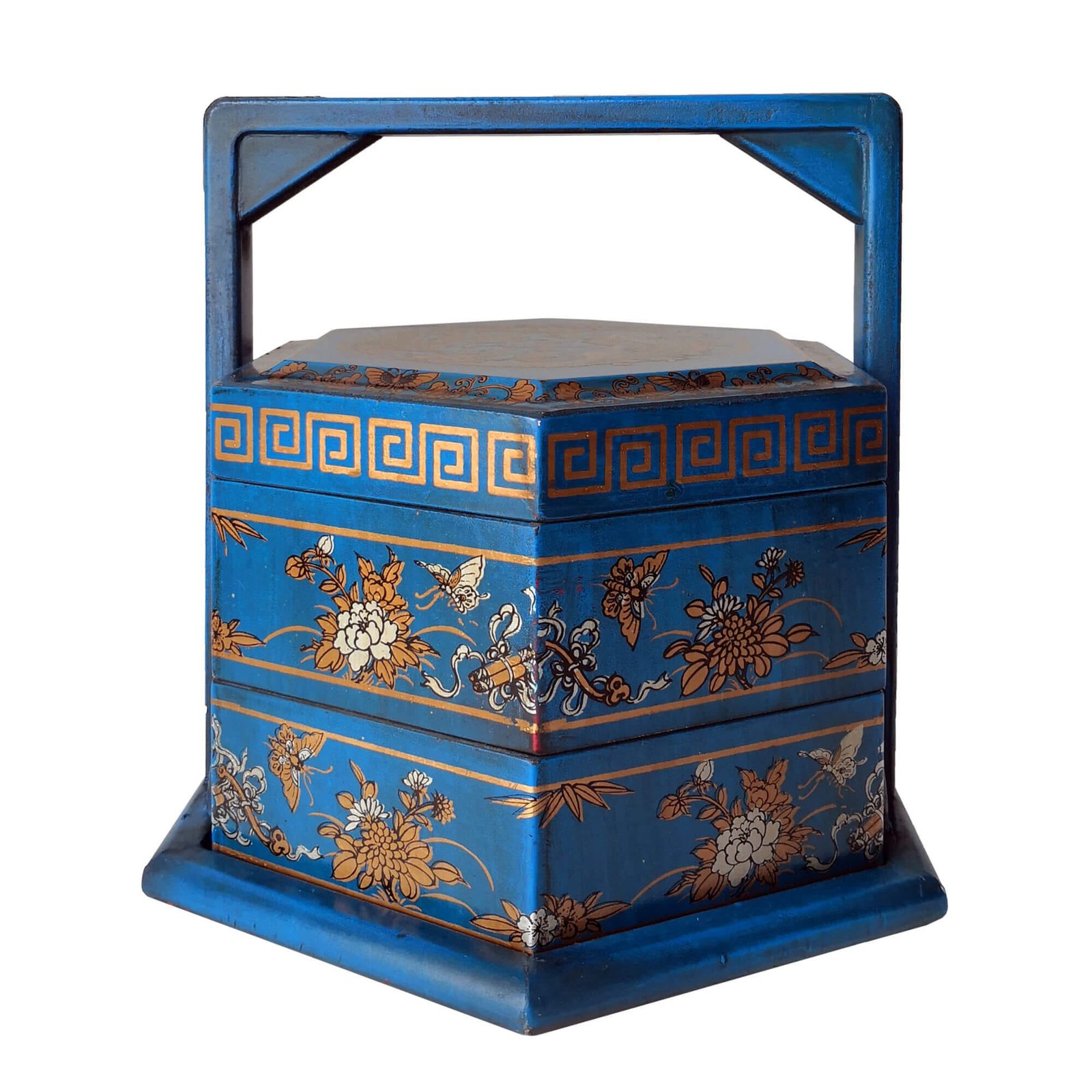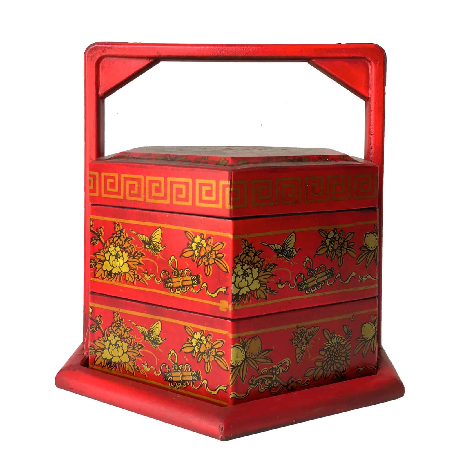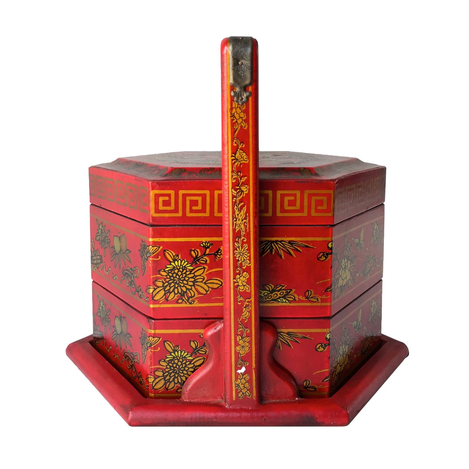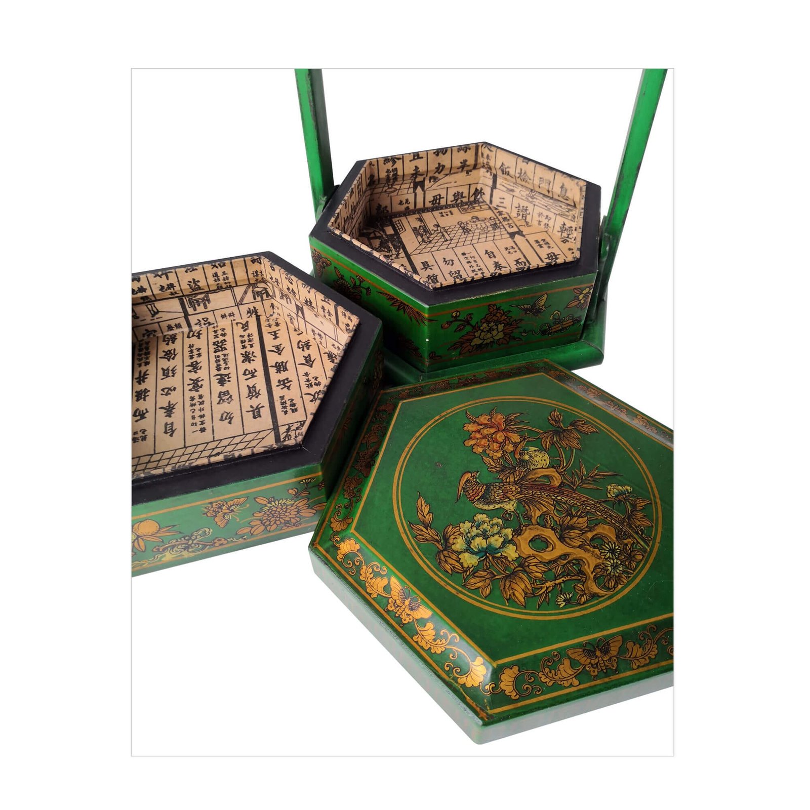 Mini 6-sided 2-tier carrier box covered with faux leather decorated with gold paintings, the inside is lined with prints of old chinese literature. L28 x W24 x H25cm.