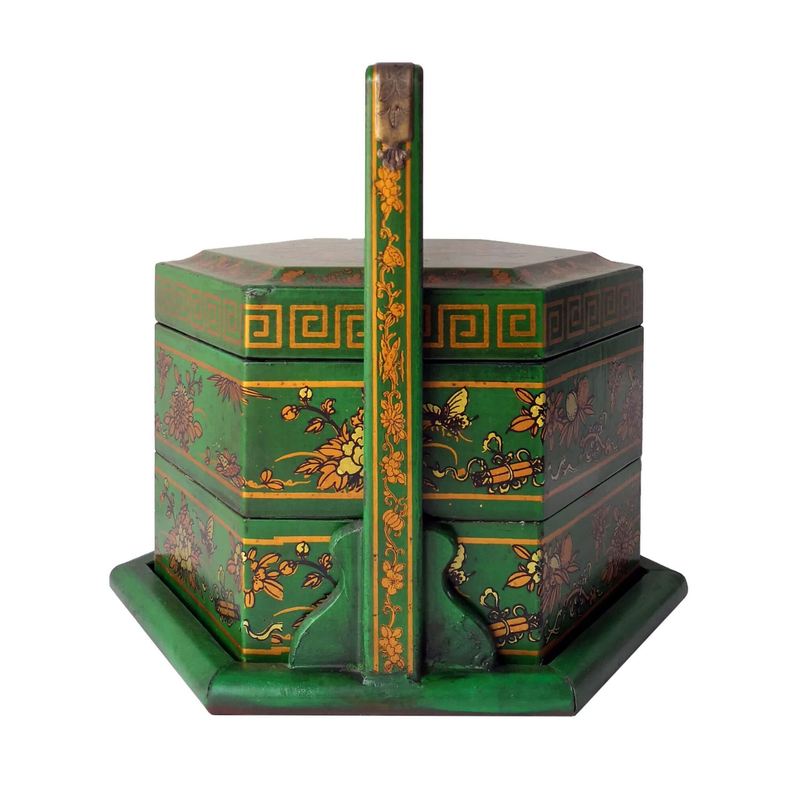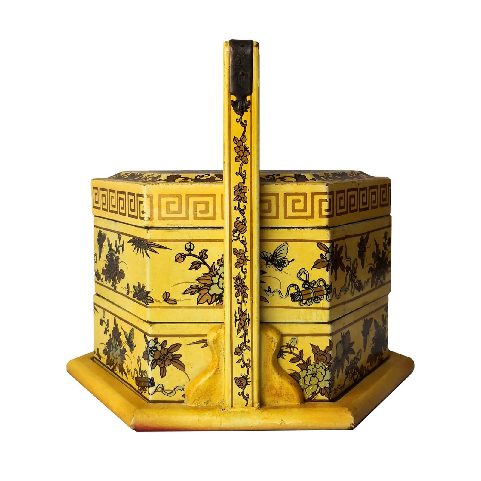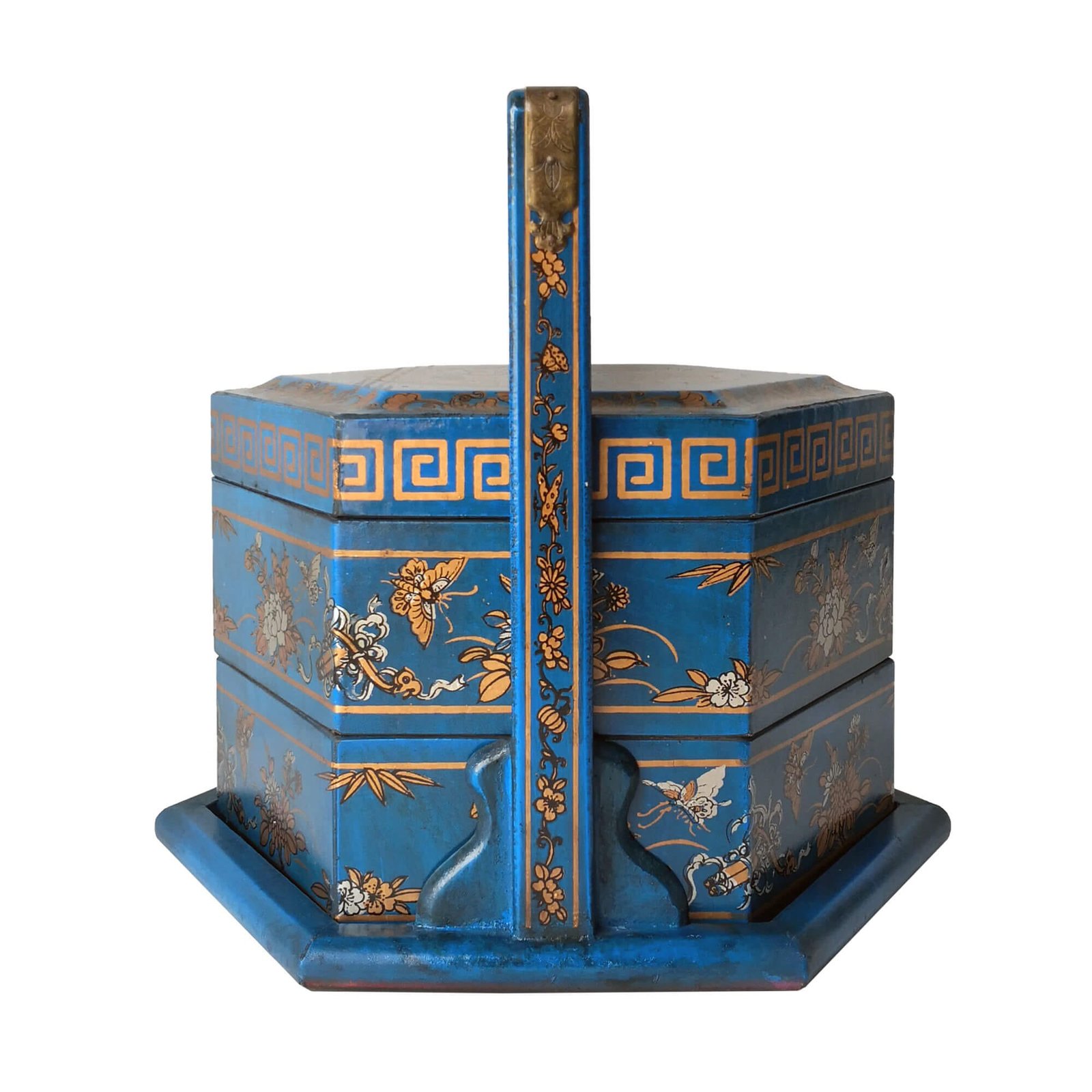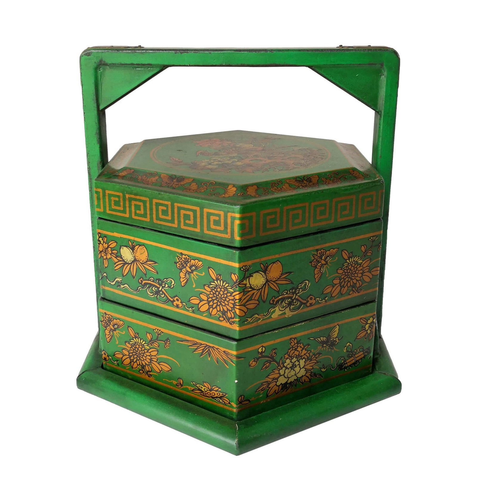 Mini 6-sided 2-tier carrier box covered with faux leather decorated with gold paintings, the inside is lined with prints of old chinese literature. L28 x W24 x H25cm.