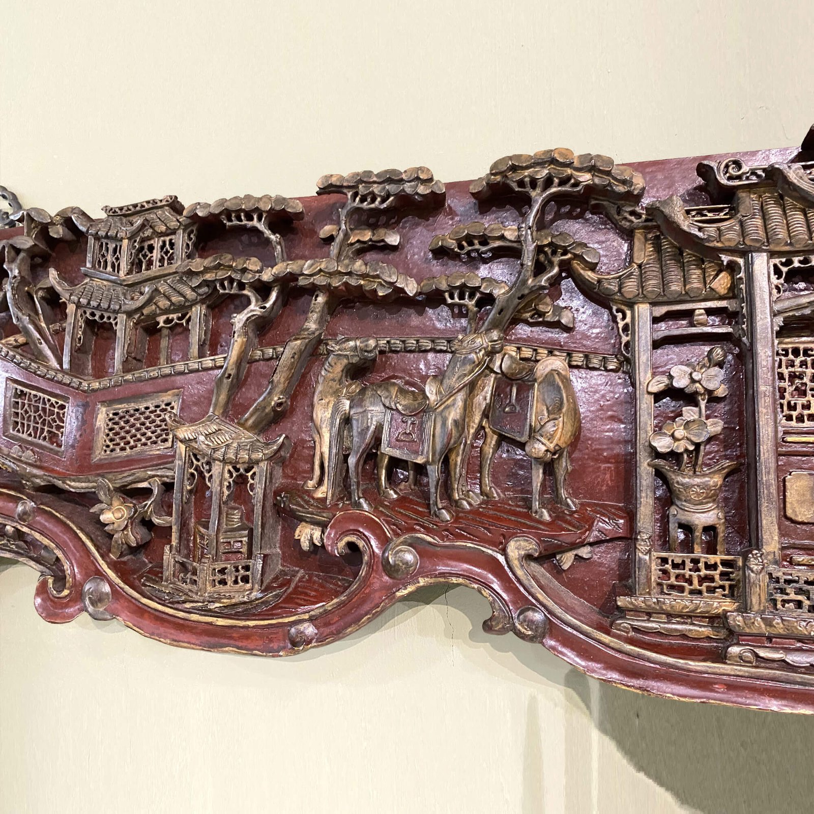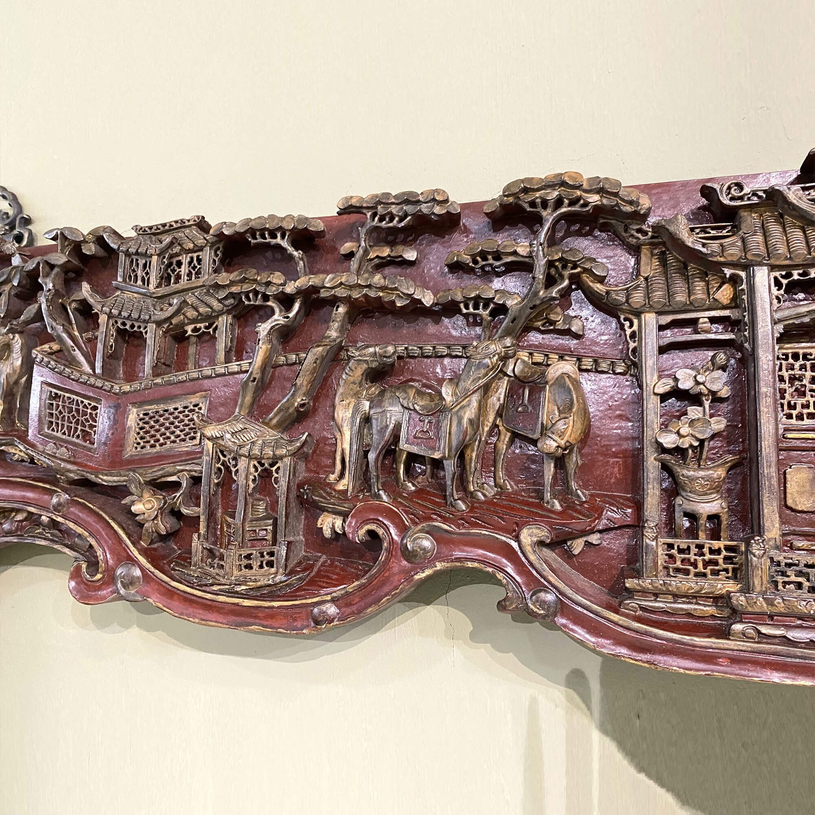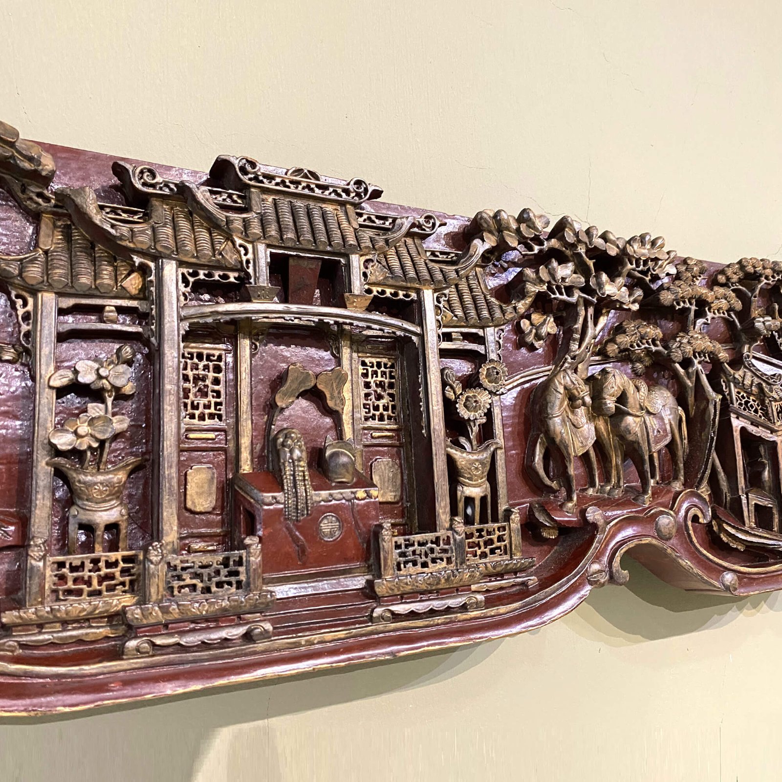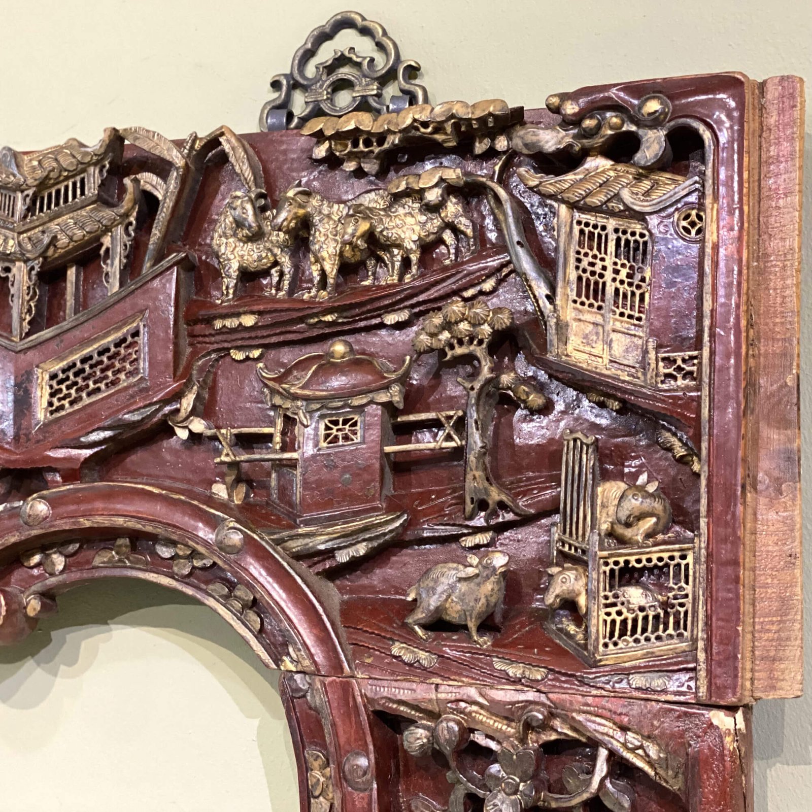 A very interesting and intricate carving taken from the front of a large canopy bed. The carvings on this piece is magnificent. It has lots of different auspicious symbols, animals, trees and very detailed architectural structures, all extremely three-dimensional.