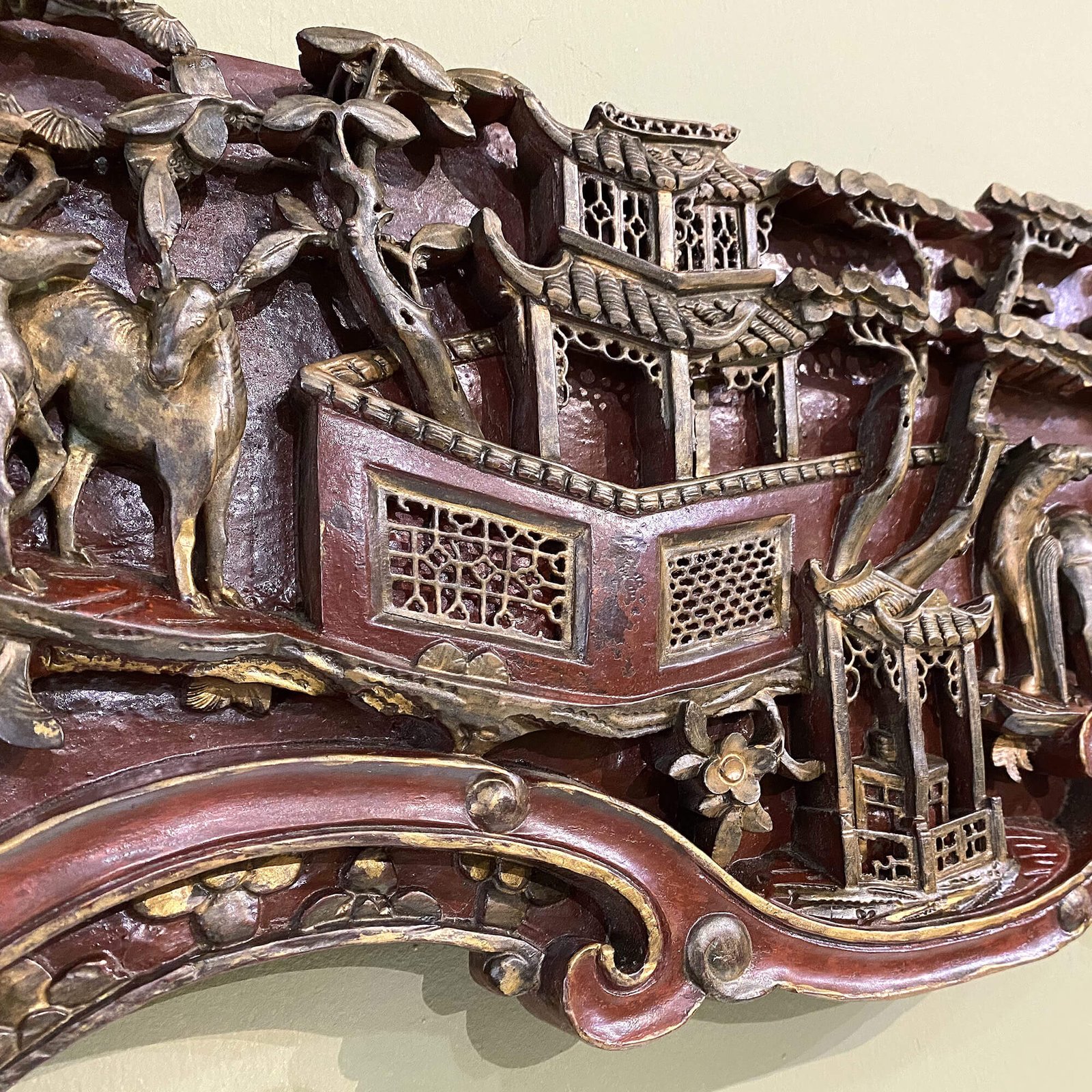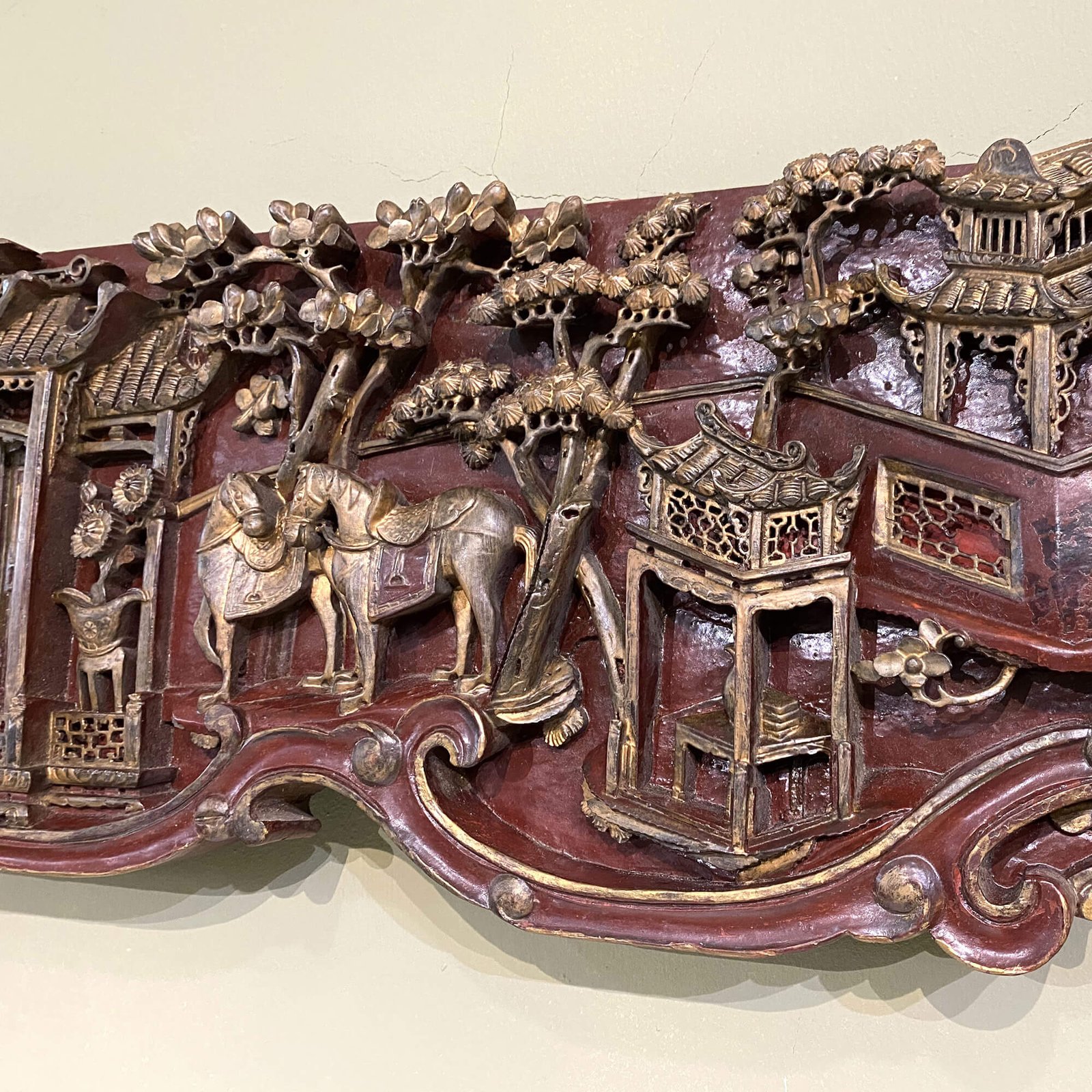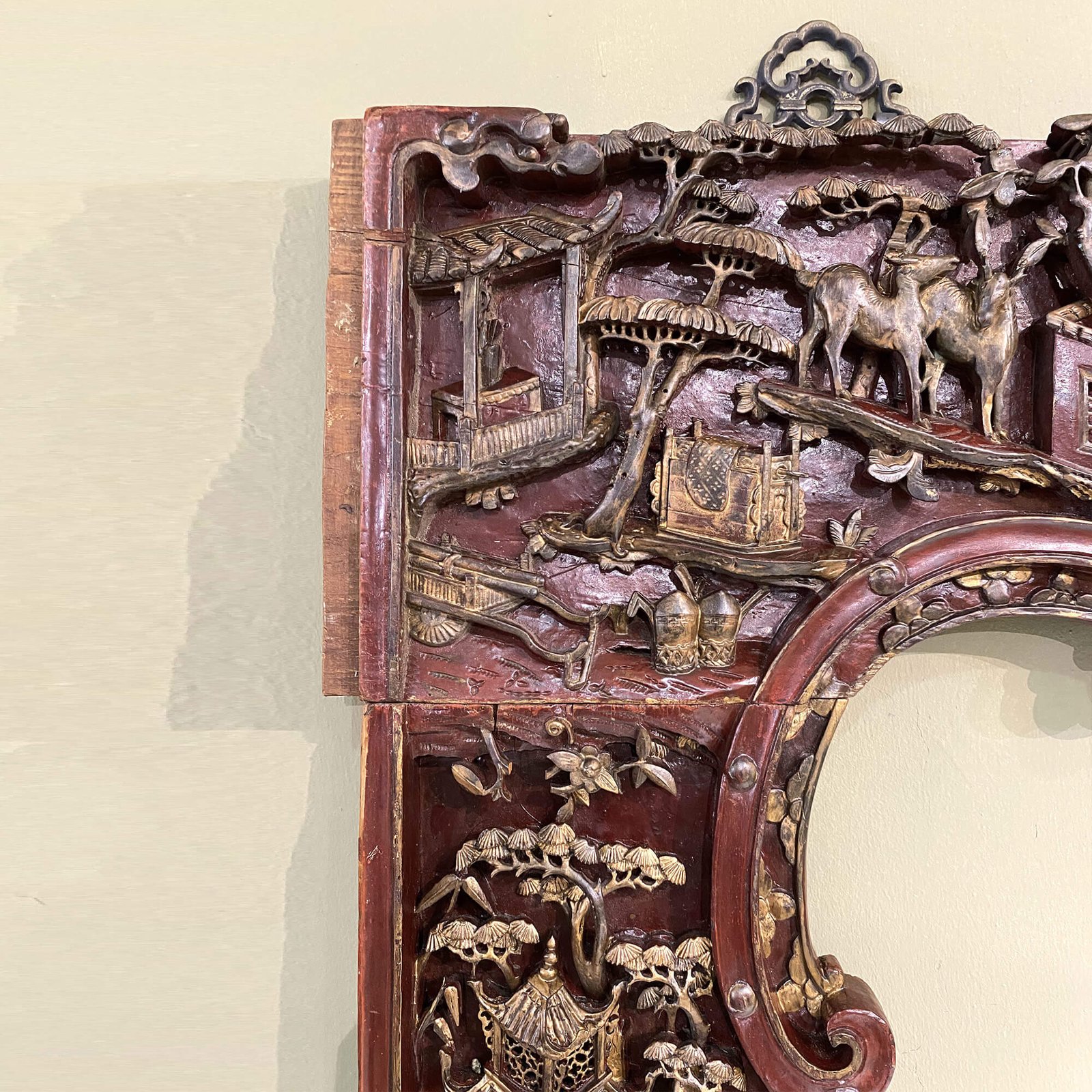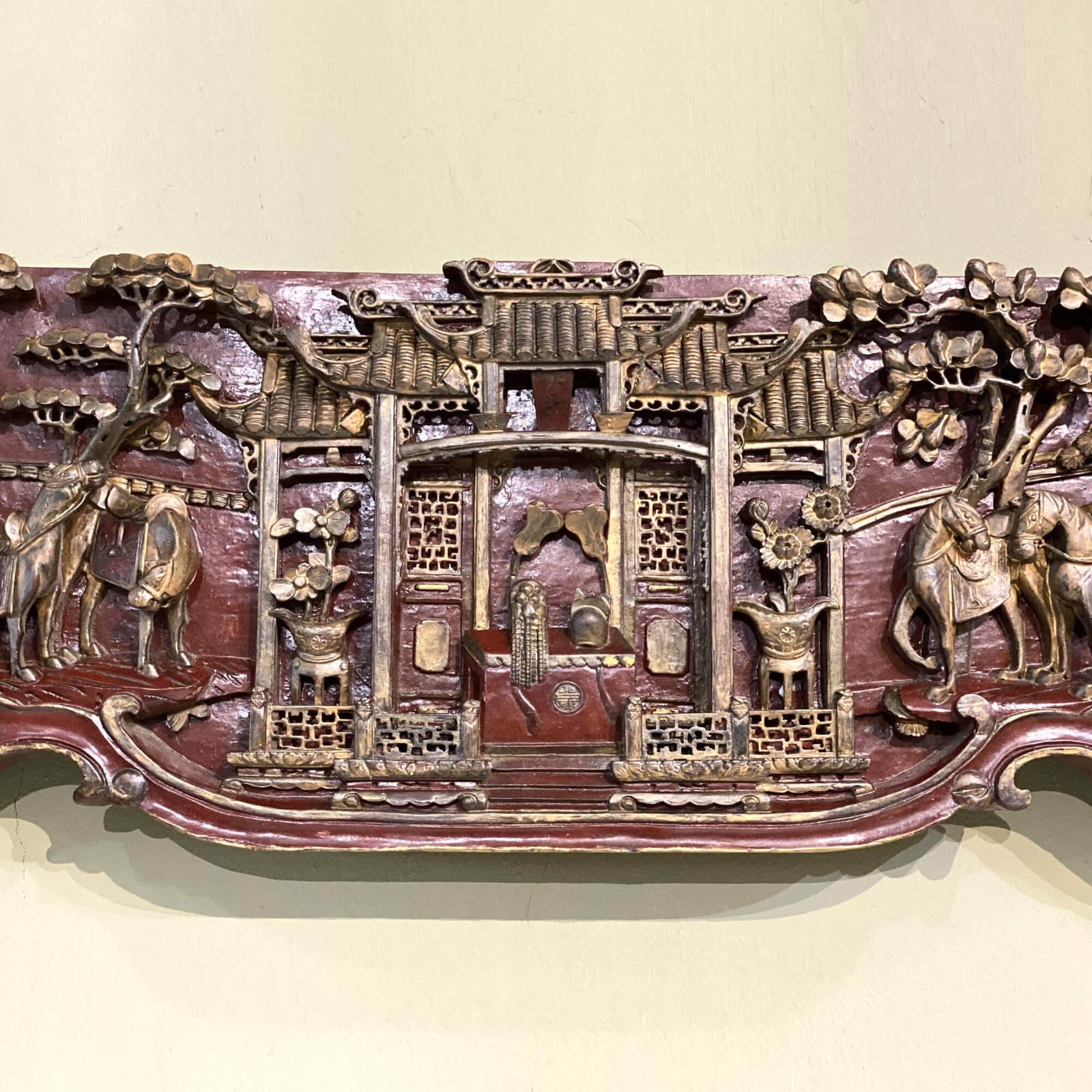 A very interesting and intricate carving taken from the front of a large canopy bed. The carvings on this piece is magnificent. It has lots of different auspicious symbols, animals, trees and very detailed architectural structures, all extremely three-dimensional.
