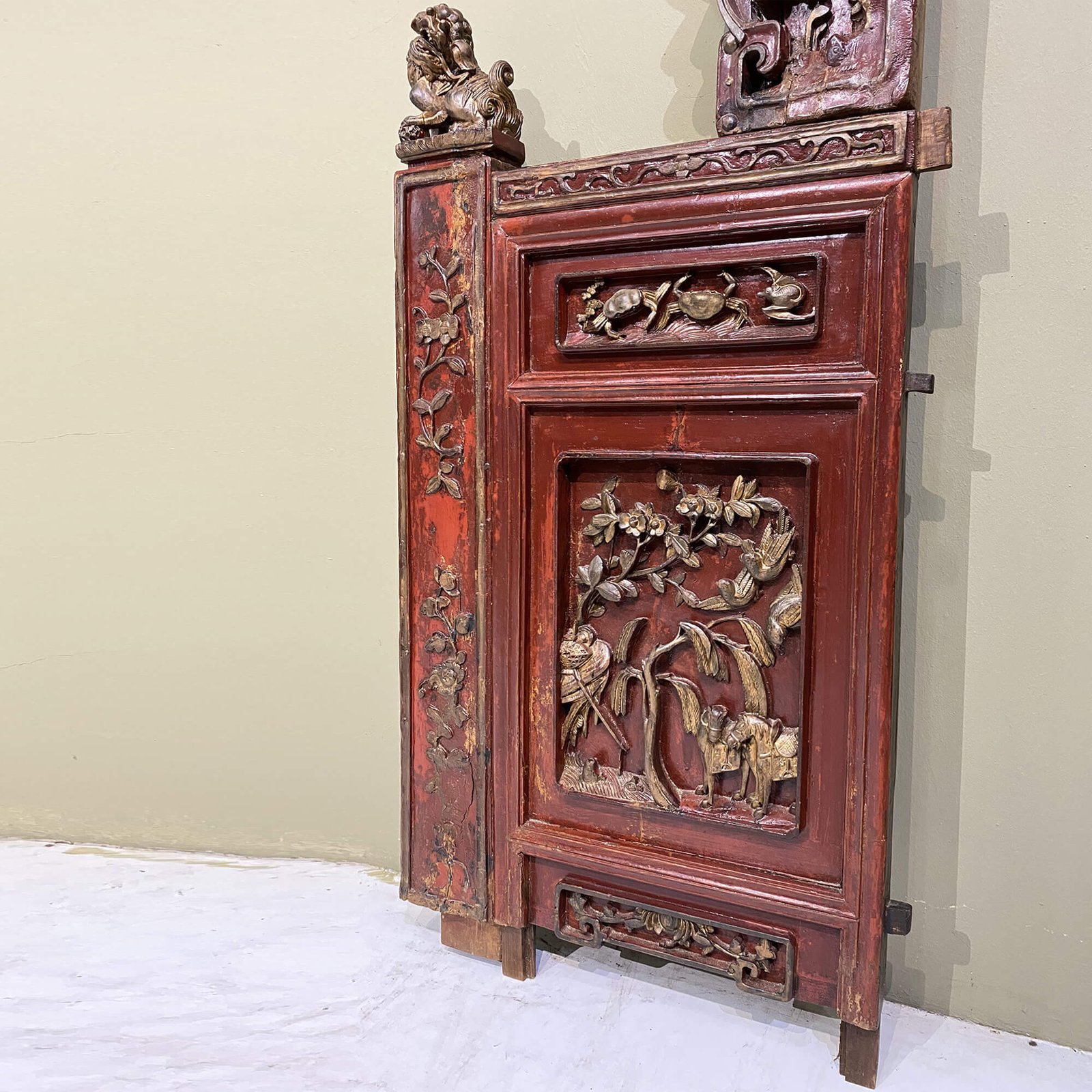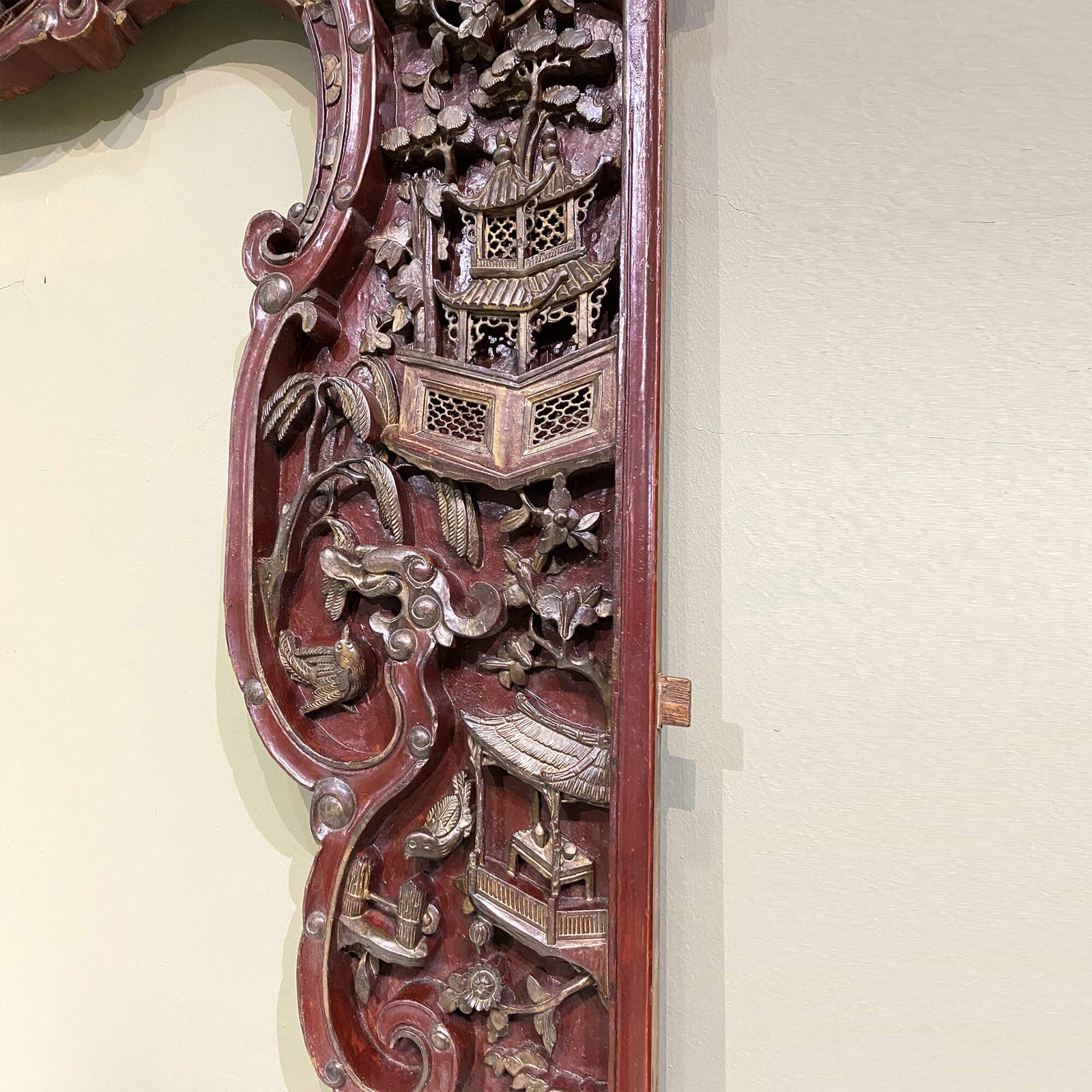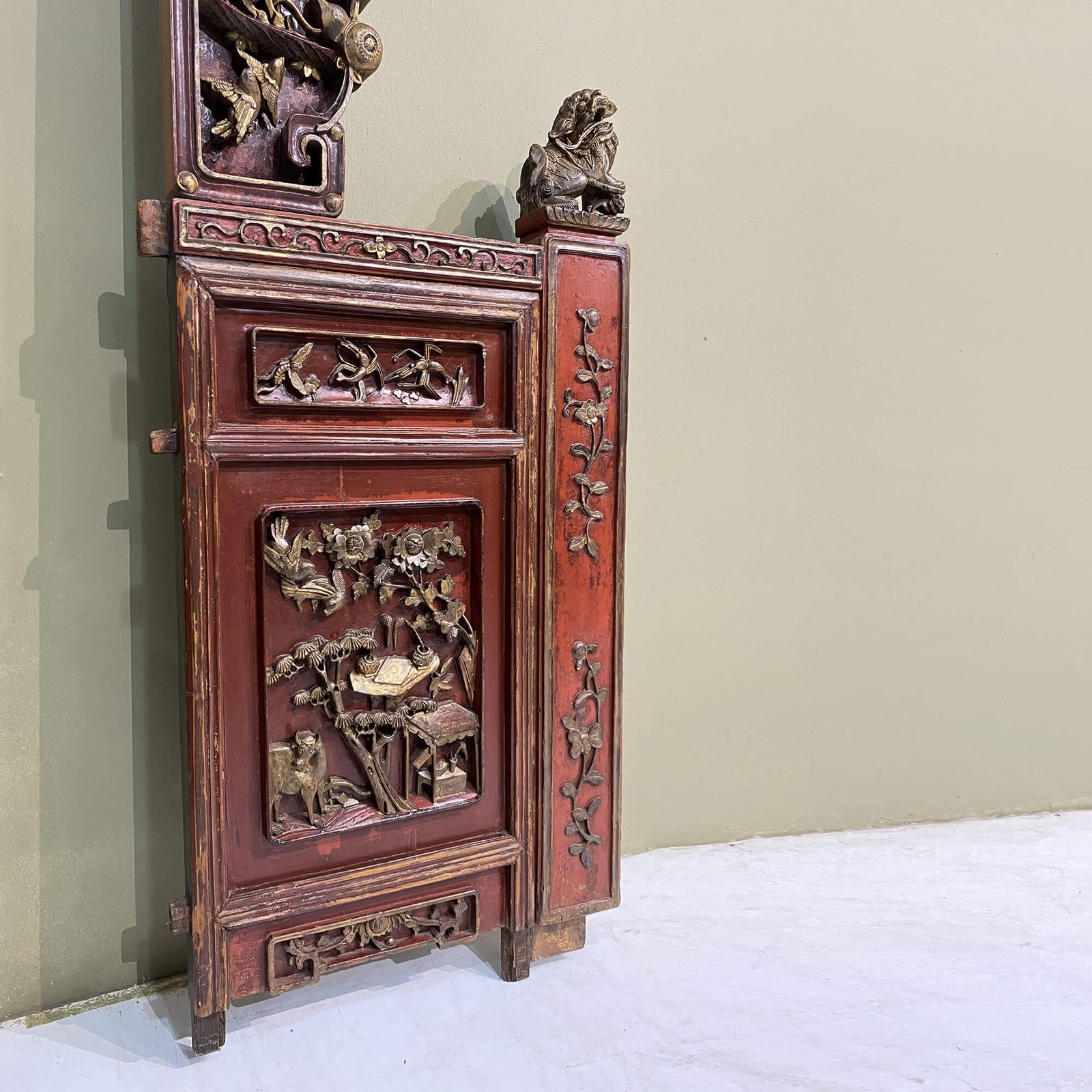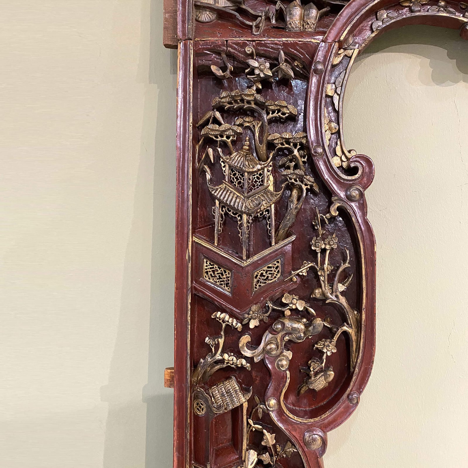A very interesting and intricate carving taken from the front of a large canopy bed. The carvings on this piece is magnificent. It has lots of different auspicious symbols, animals, trees and very detailed architectural structures, all extremely three-dimensional.