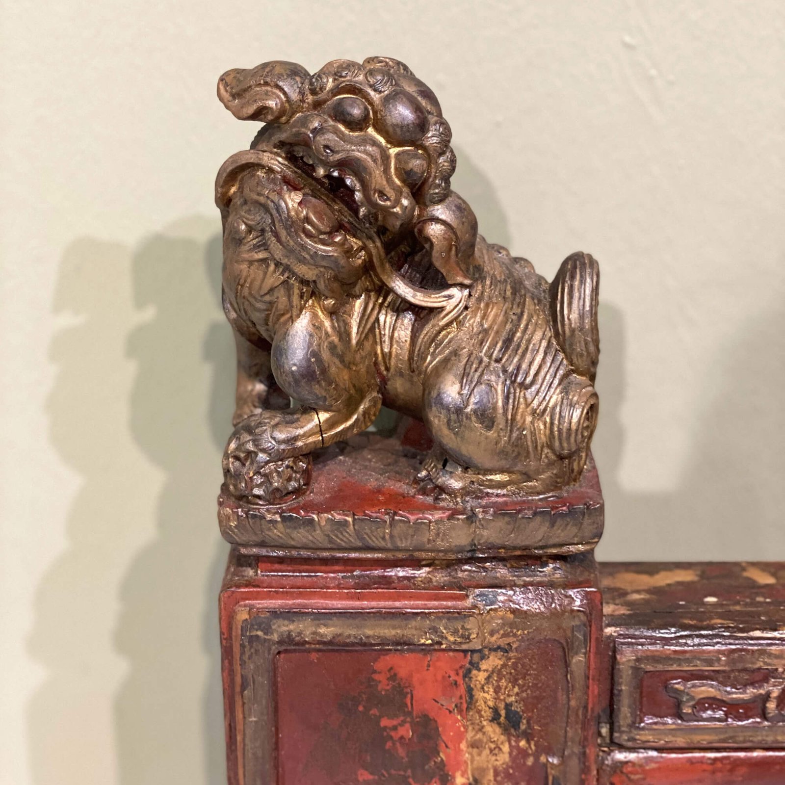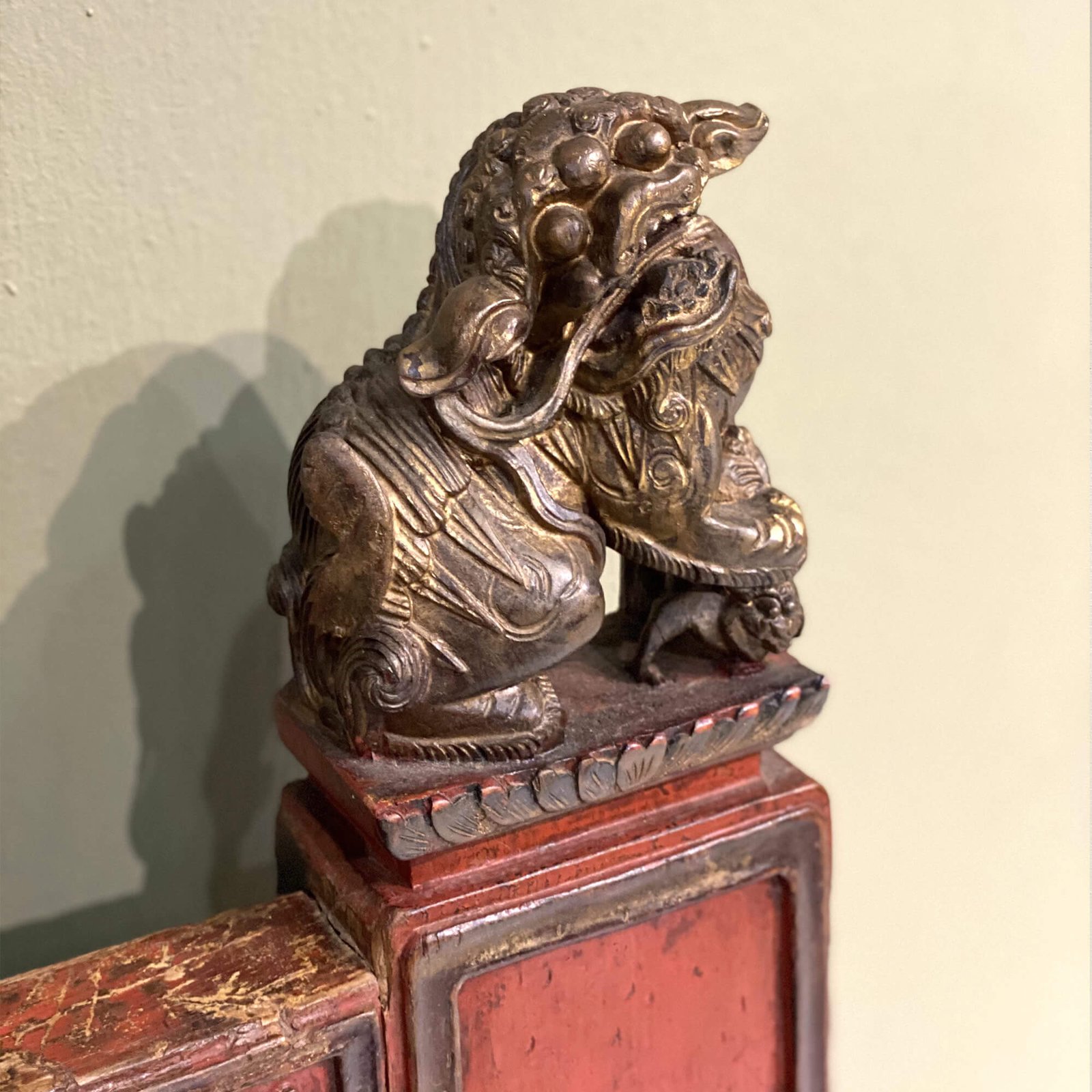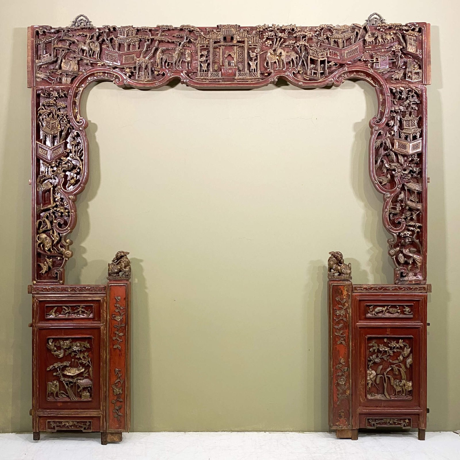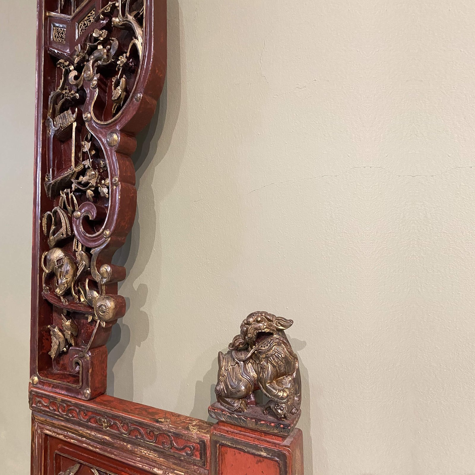 A very interesting and intricate carving taken from the front of a large canopy bed. The carvings on this piece is magnificent. It has lots of different auspicious symbols, animals, trees and very detailed architectural structures, all extremely three-dimensional.