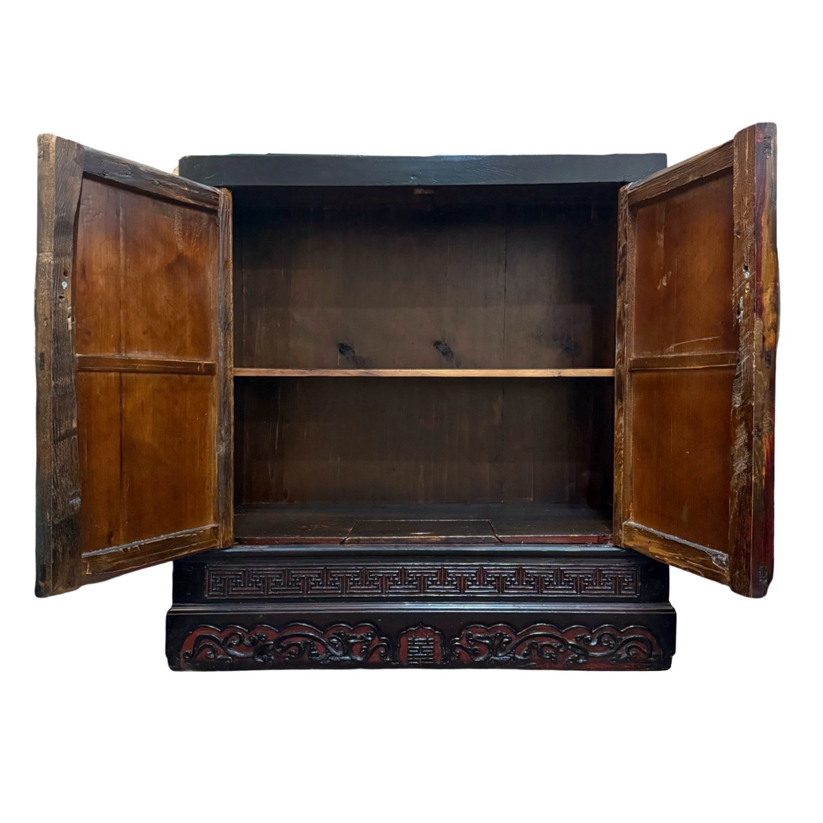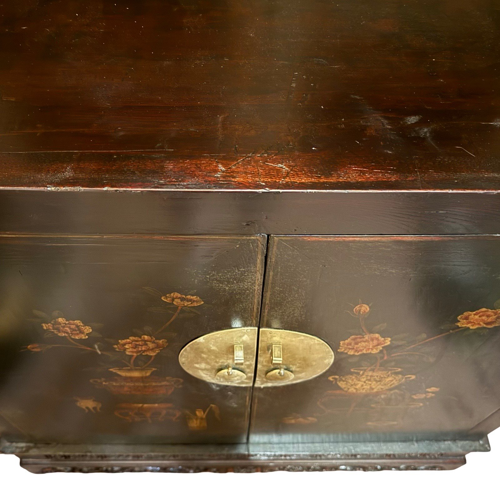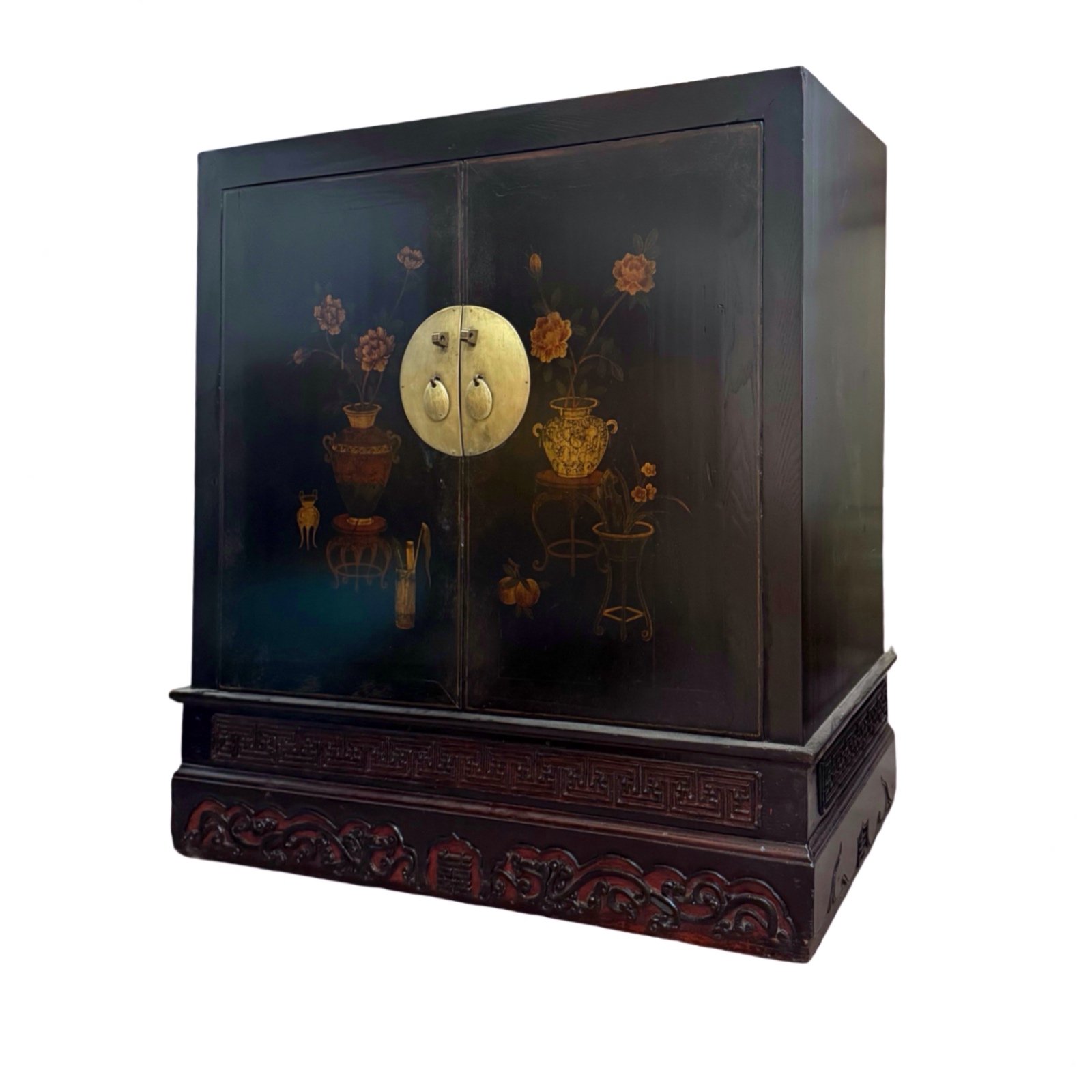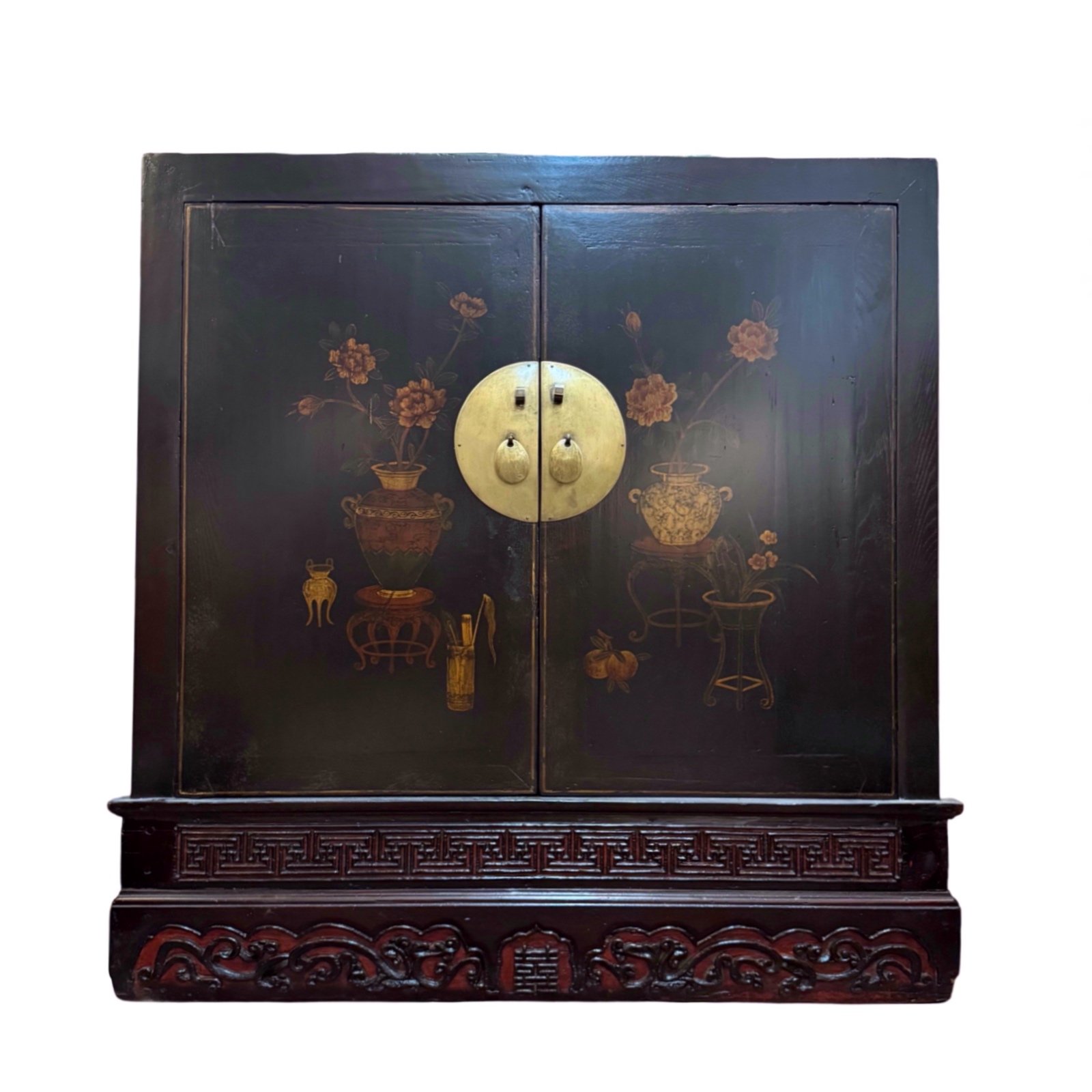 A vintage 2-door Elmwood chest from Shandong with beautiful paintings of flowers in flower pots, vessels, curio stands and fruits. The base has beautiful relief carvings including a double happiness symbol in the middle.