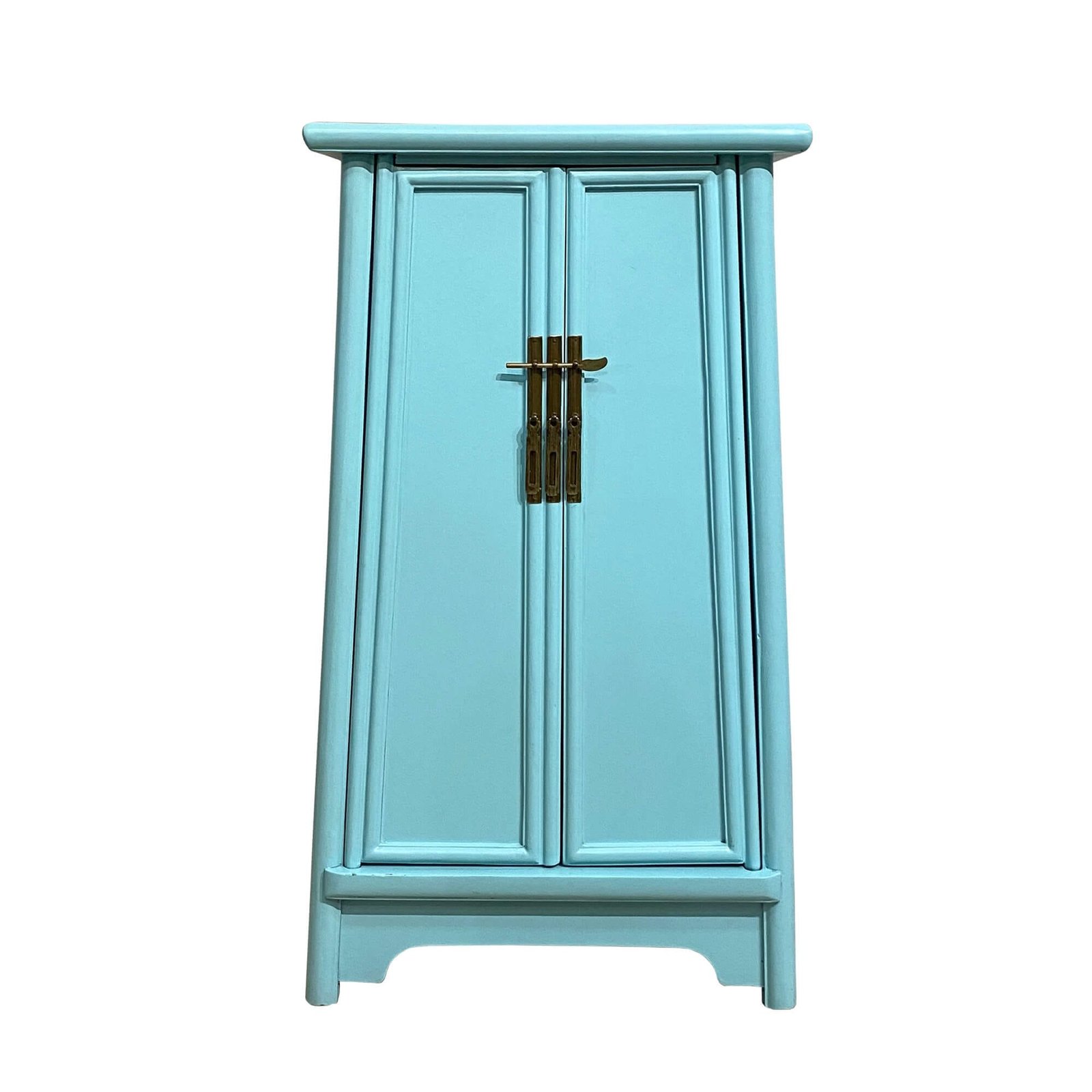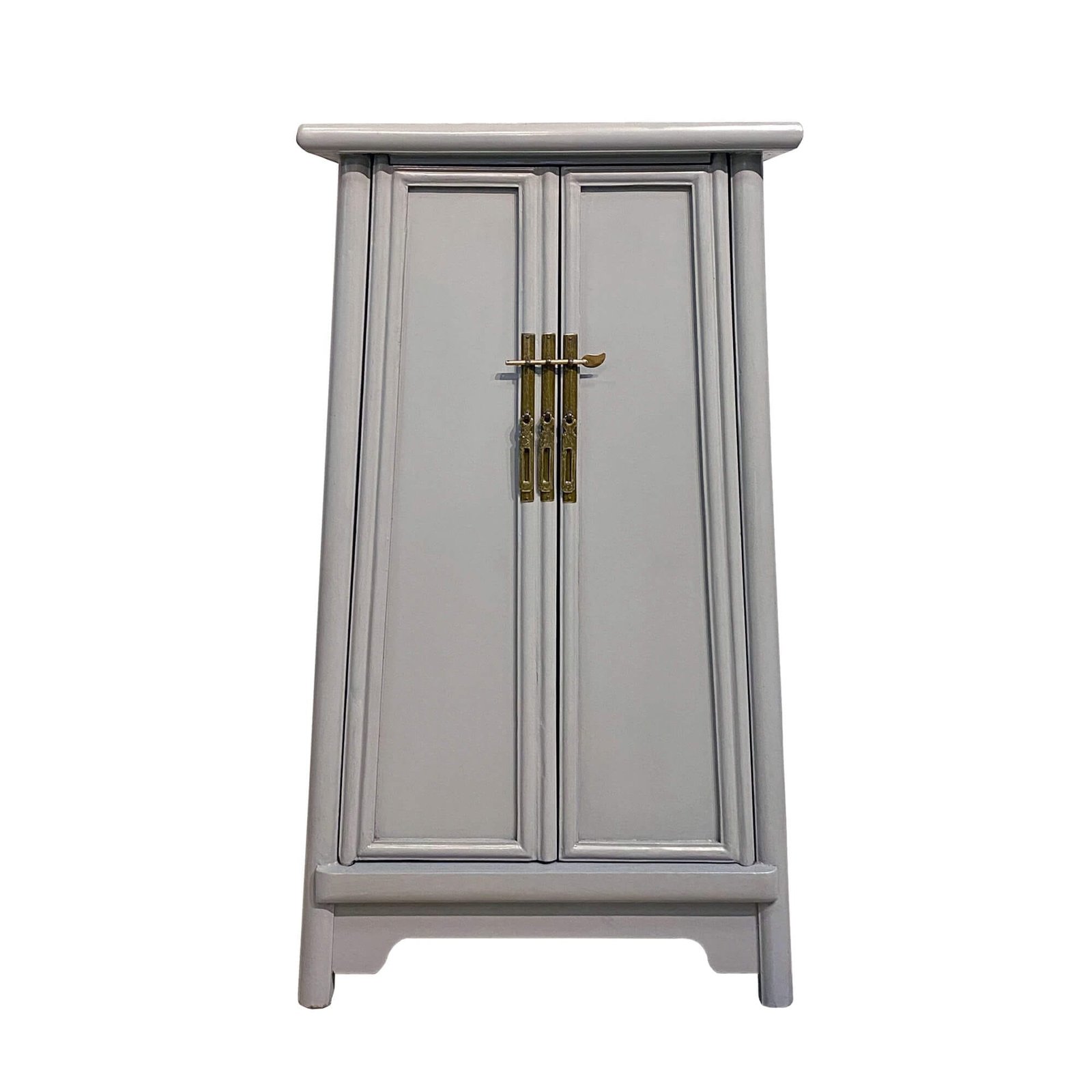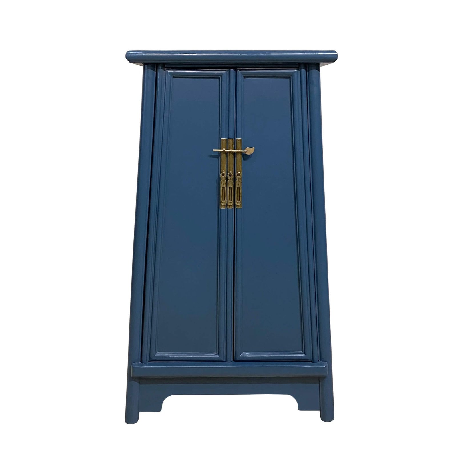 Slim A-shaped Chinese cabinet with two removable shelves inside. All colours are in a semi-gloss finish and the brass handles have been given an antique finish.