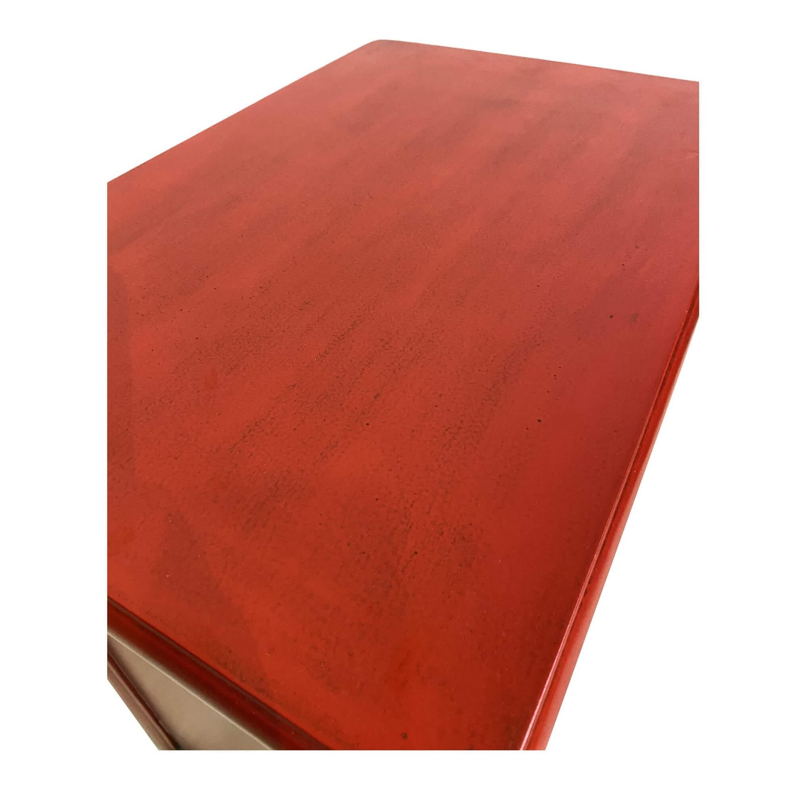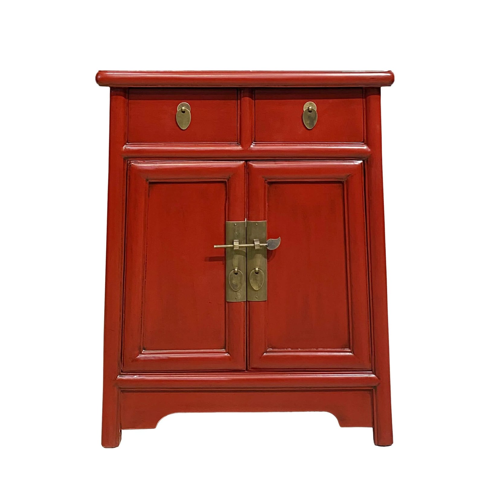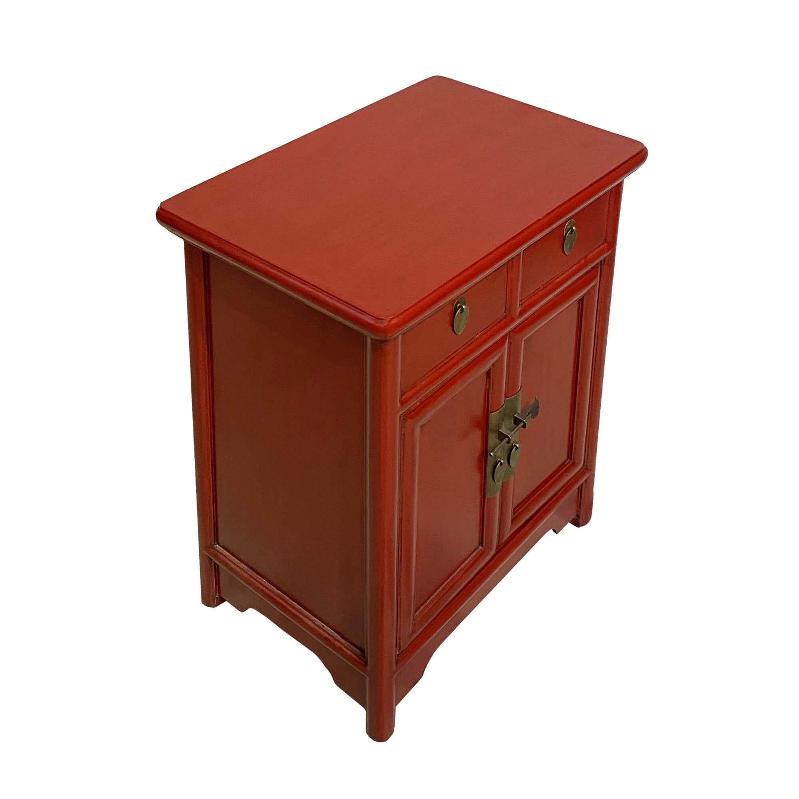 A-shaped Chinese bedside cabinet with 2 drawers and storage below, there is one removable shelf inside. Coloured pieces are in a semi-gloss finish, while the wood colours are matte. Brass handles have been given an antique finish.