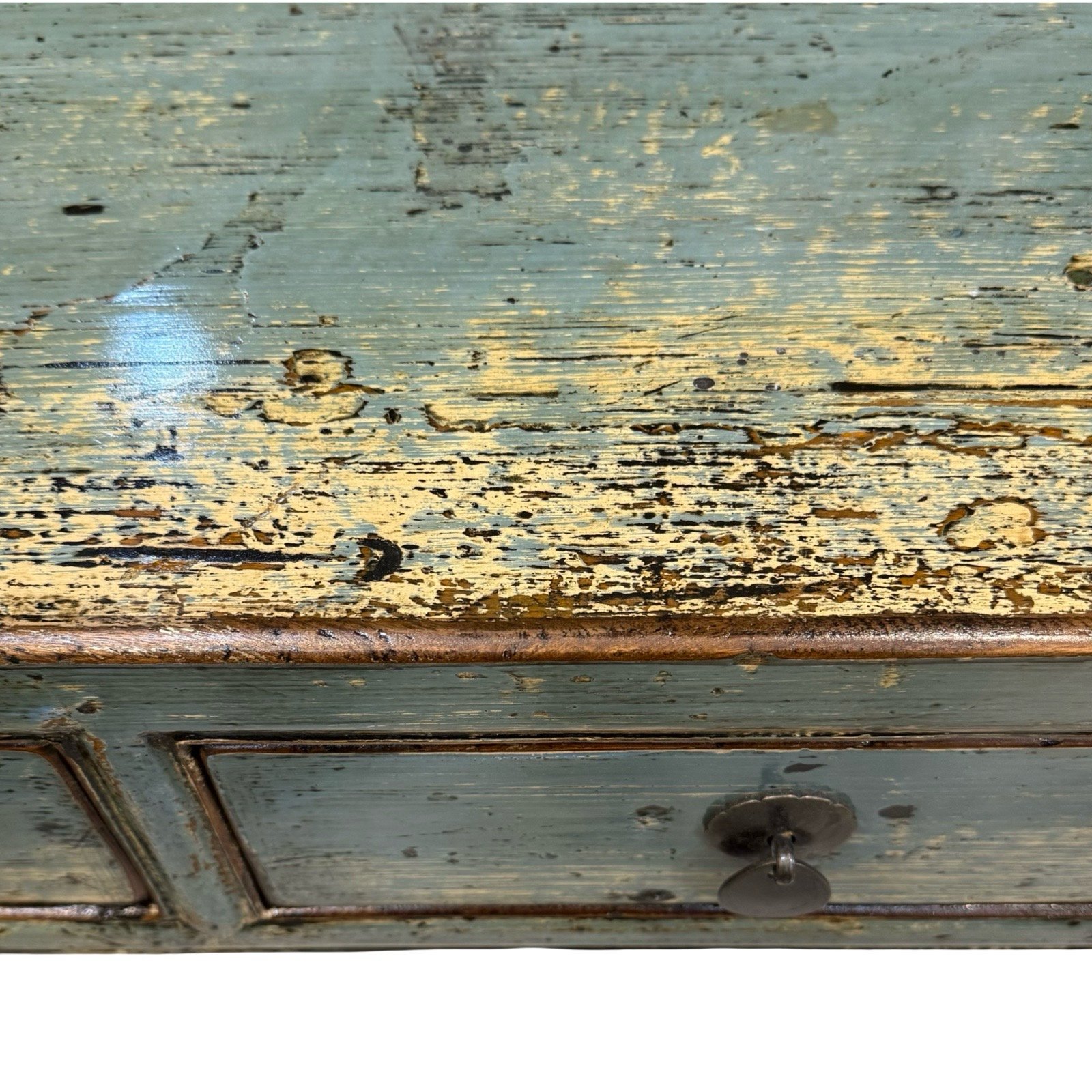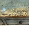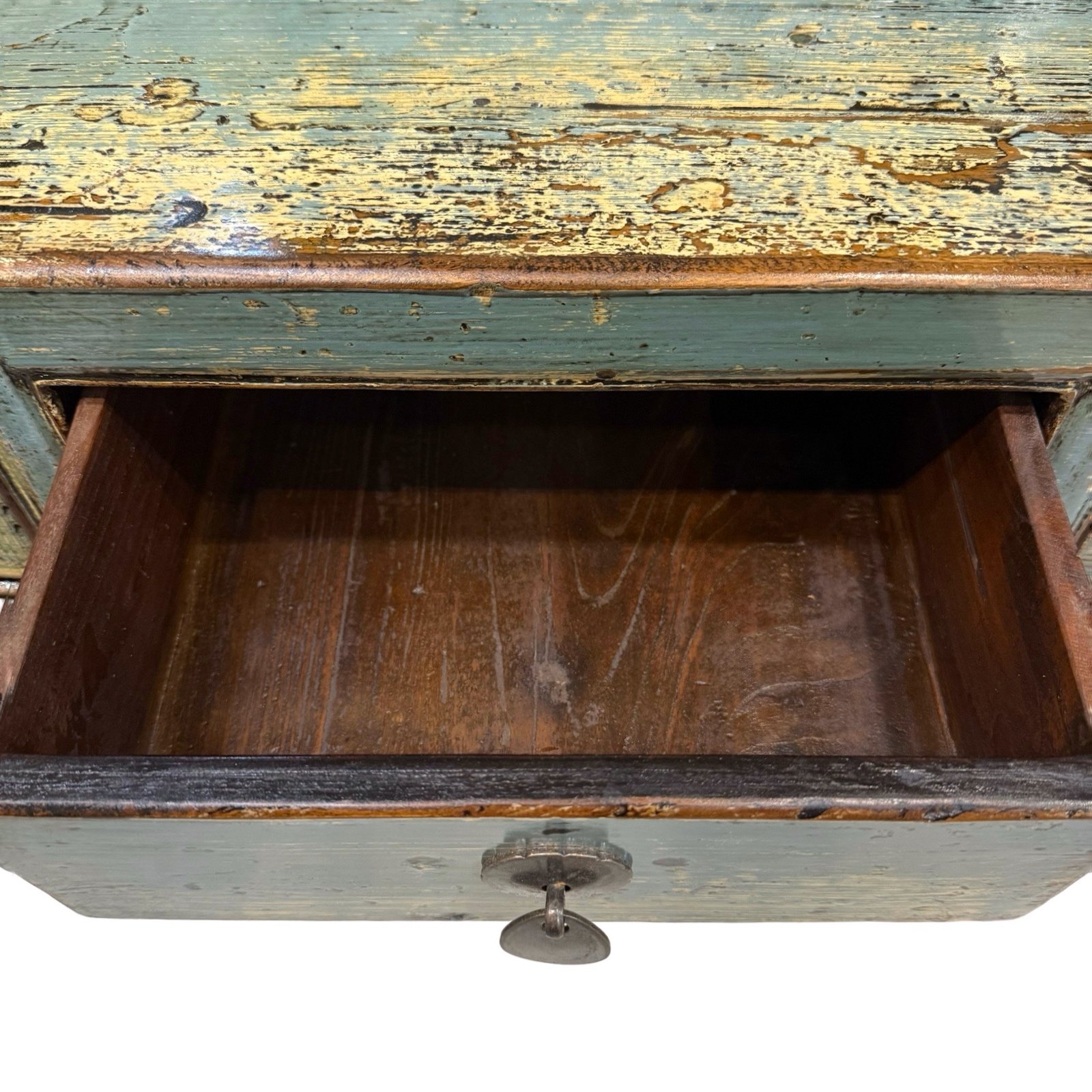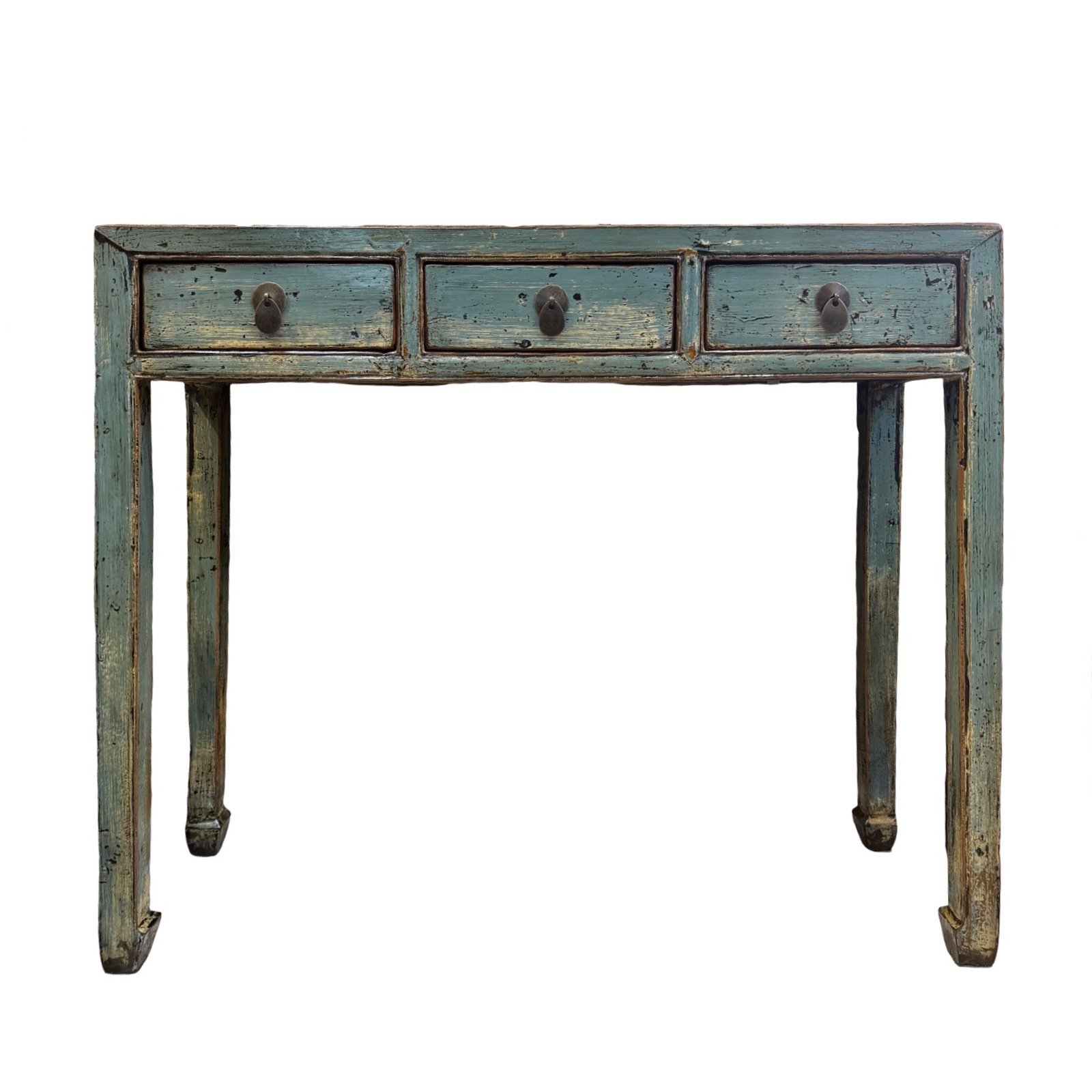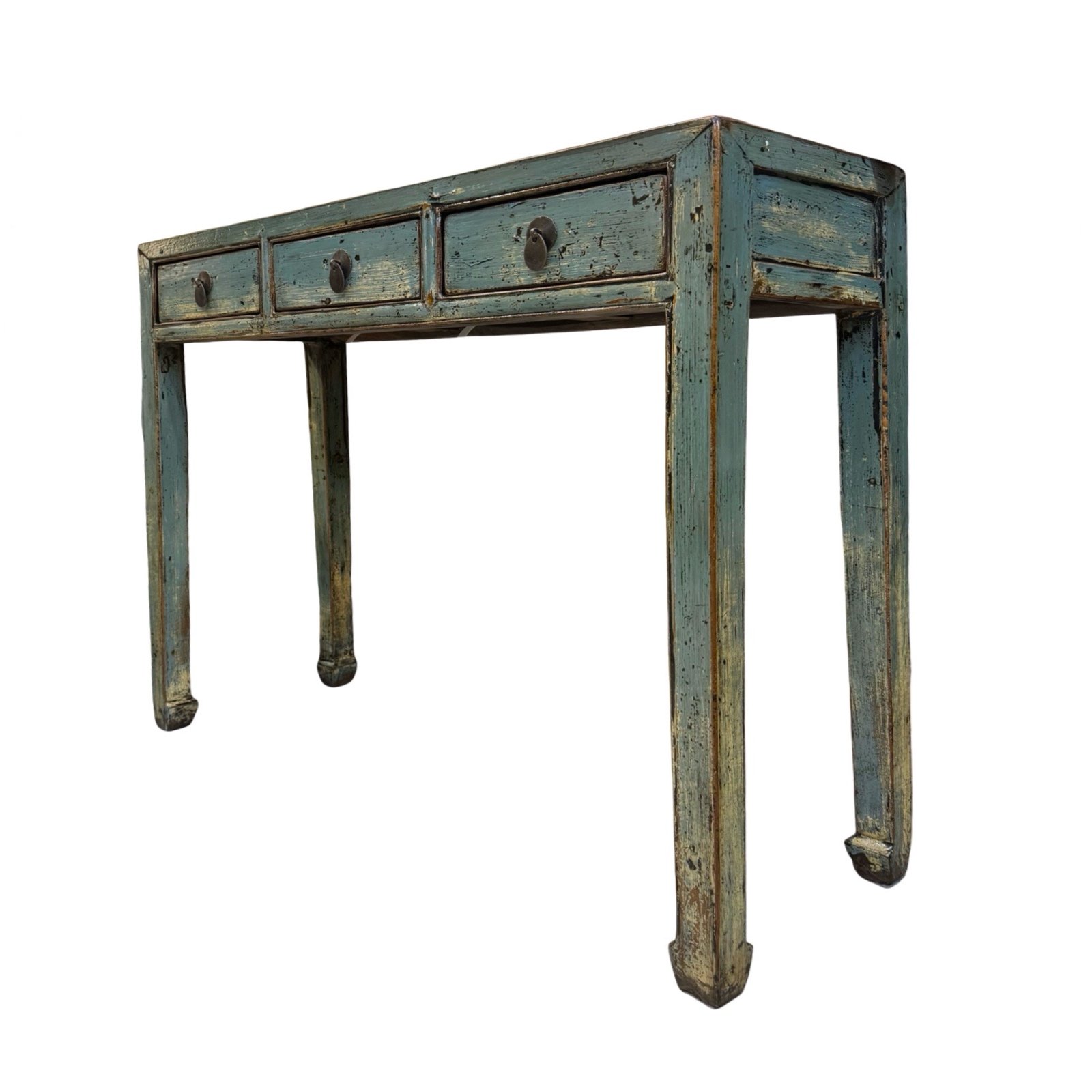 A slim vintage Pinewood table from Shandong. A functional piece with 3 drawers across, small hoof feet and finished in a beautiful distressed glossy aqua colour.