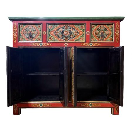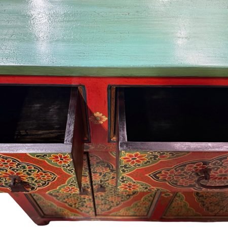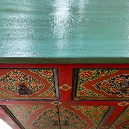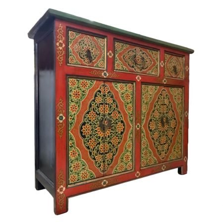 A newly made tall sideboard with hand-painted Tibetan-style designs. This has a beautiful colour combination of burnt orange & green. The front of the cabinet is filled with floral motifs, and the top of the cabinet has a slightly distressed green finish.