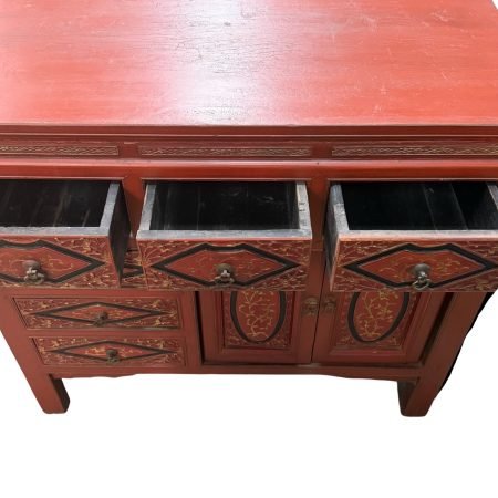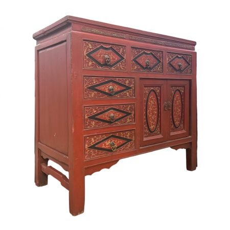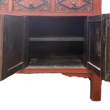 A vintage cabinet from Fujian in its charming original red colour and beautiful relief carvings.