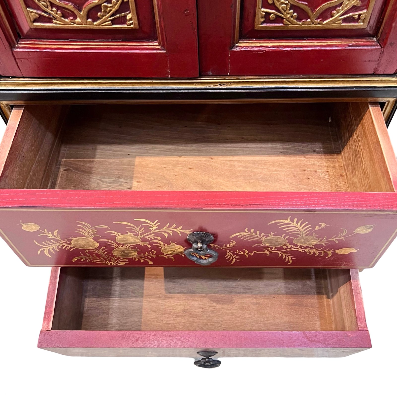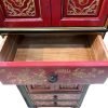 A newly-made slim cabinet with old carvings from Fujian province as its doors. The doors are approx. 80-100 years old, and have beautiful carvings plants & leaves. The flowers on the drawers are newly hand-painted.
