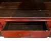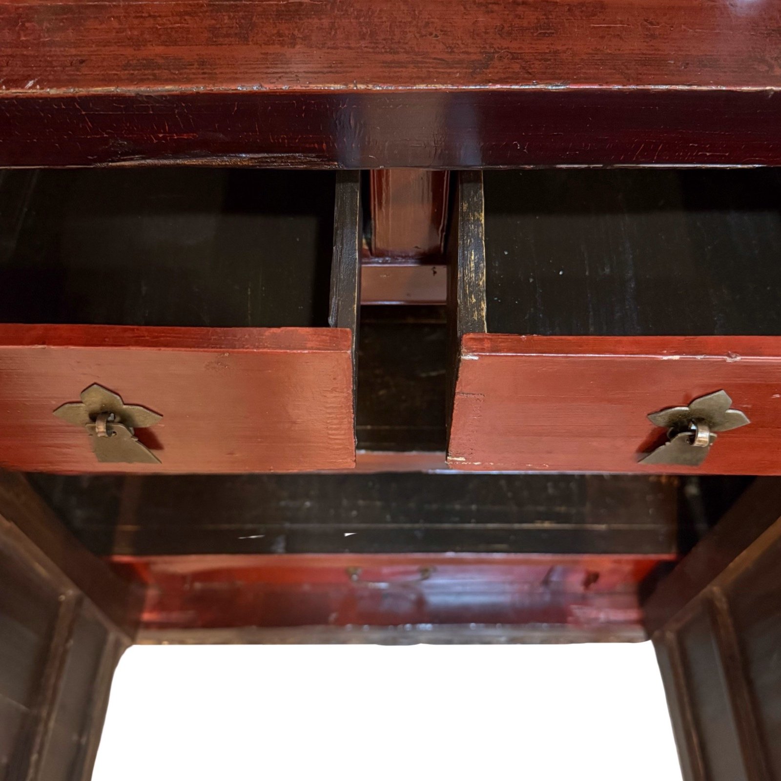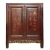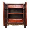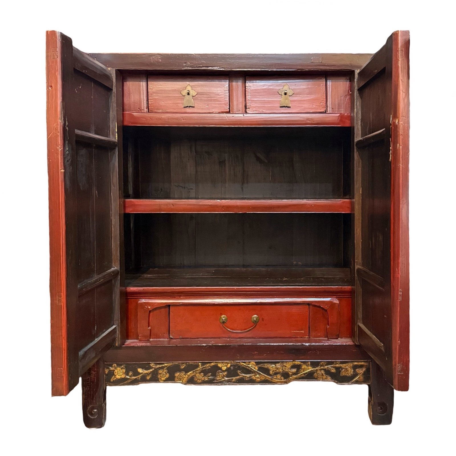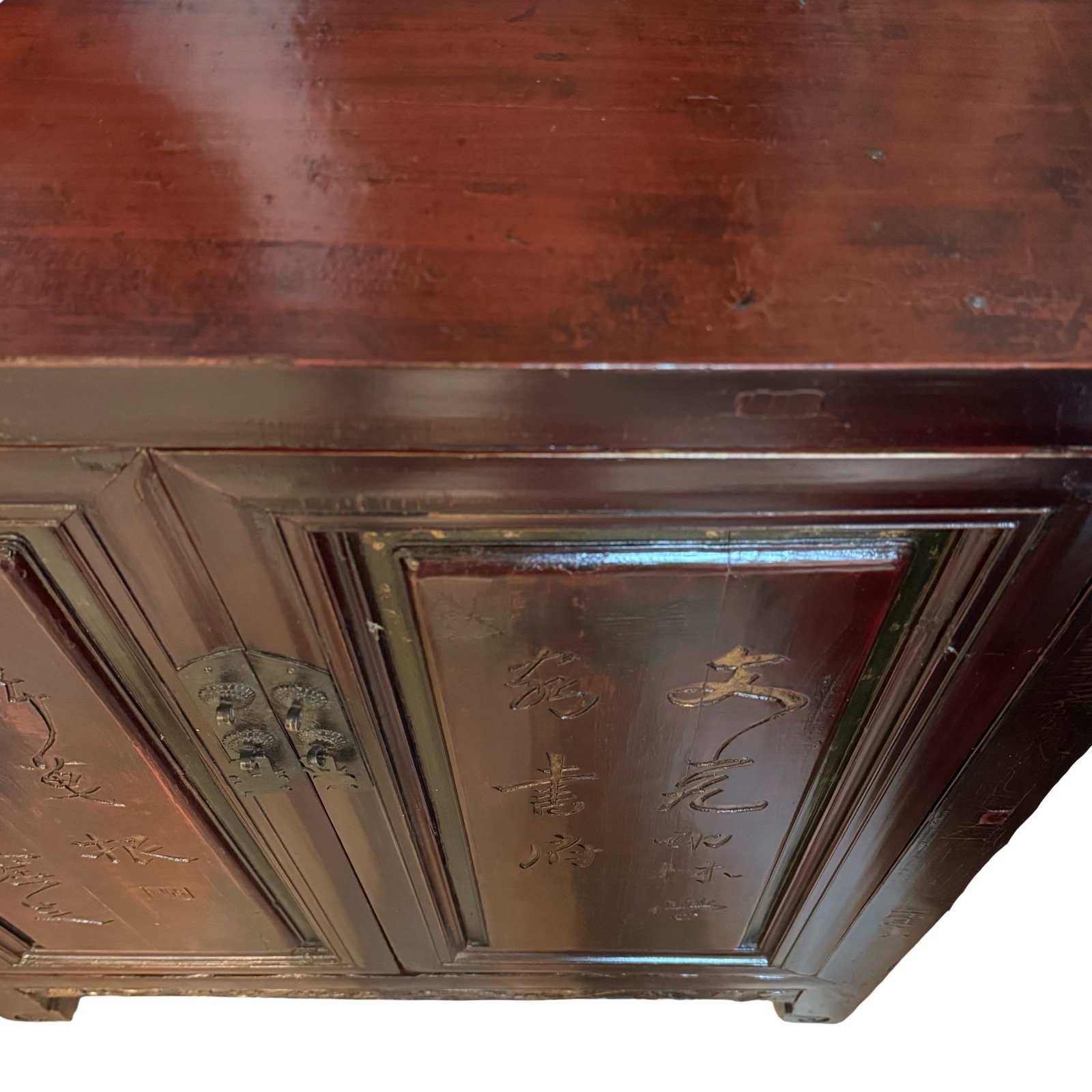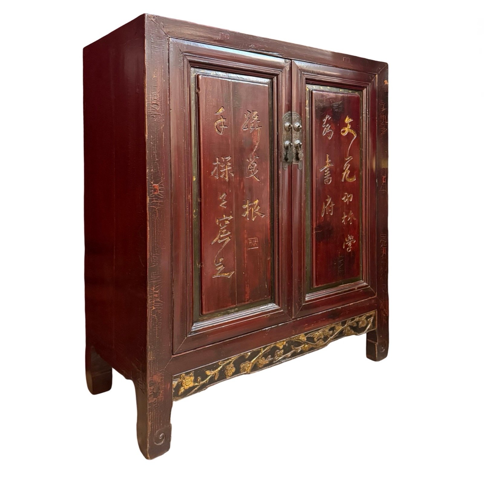 A small cabinet from Chaozhou, finished in a rich deep red tone with inscriptions carved across the doors.