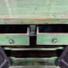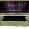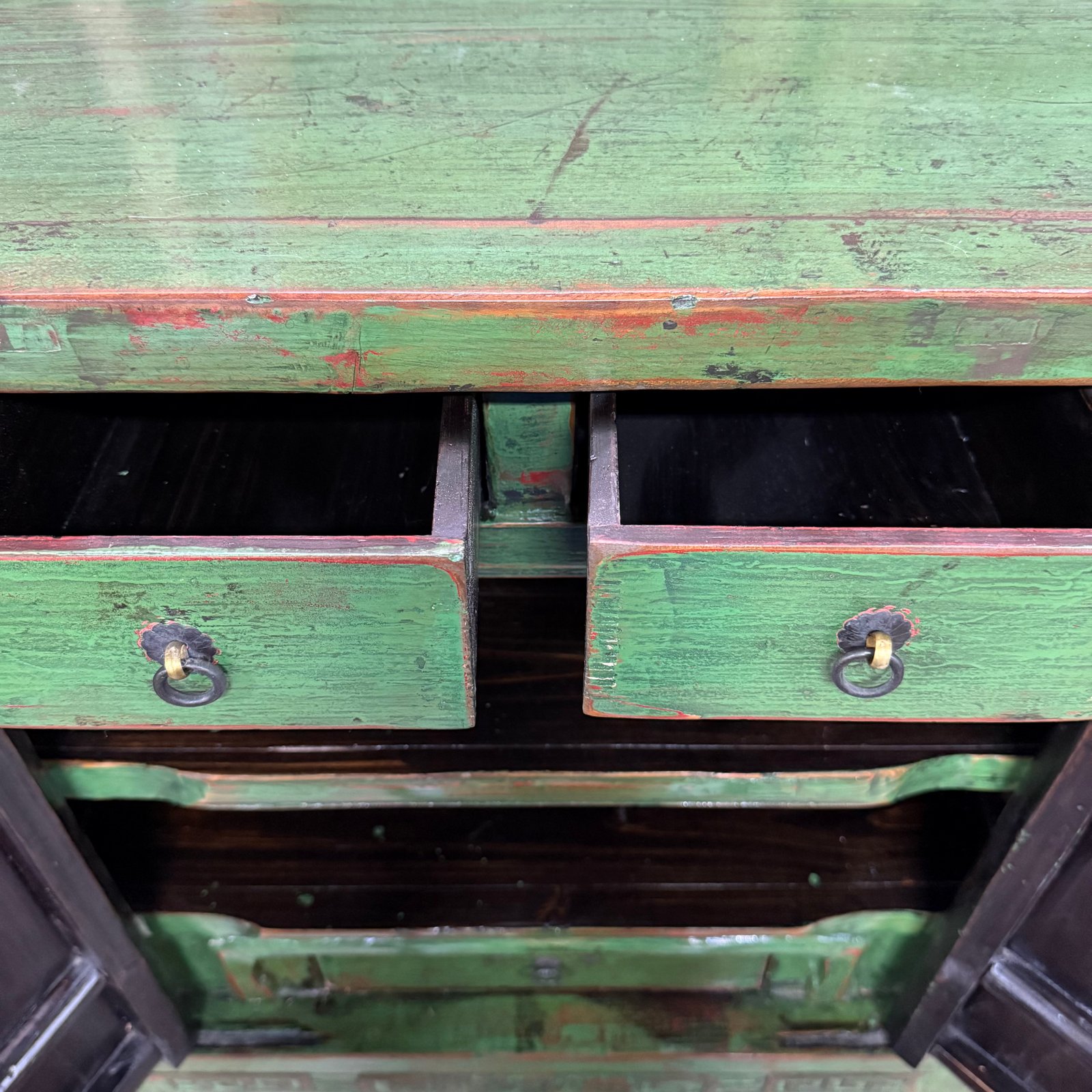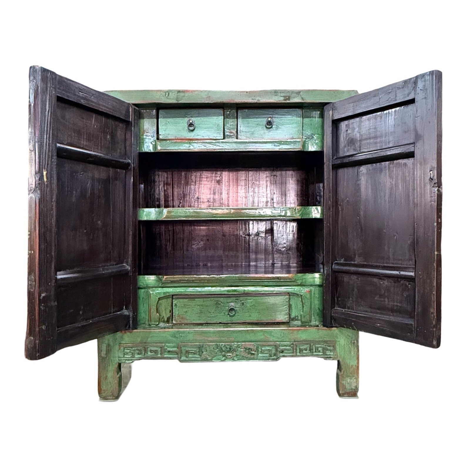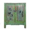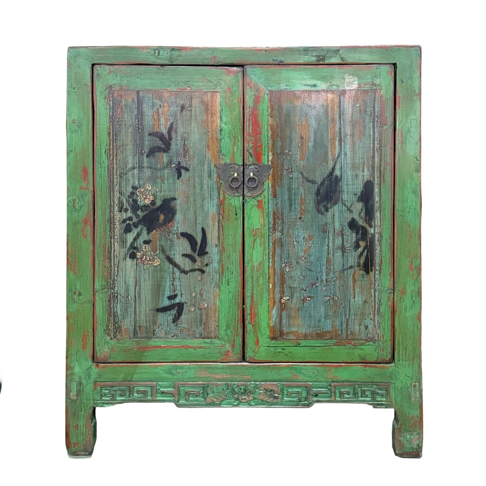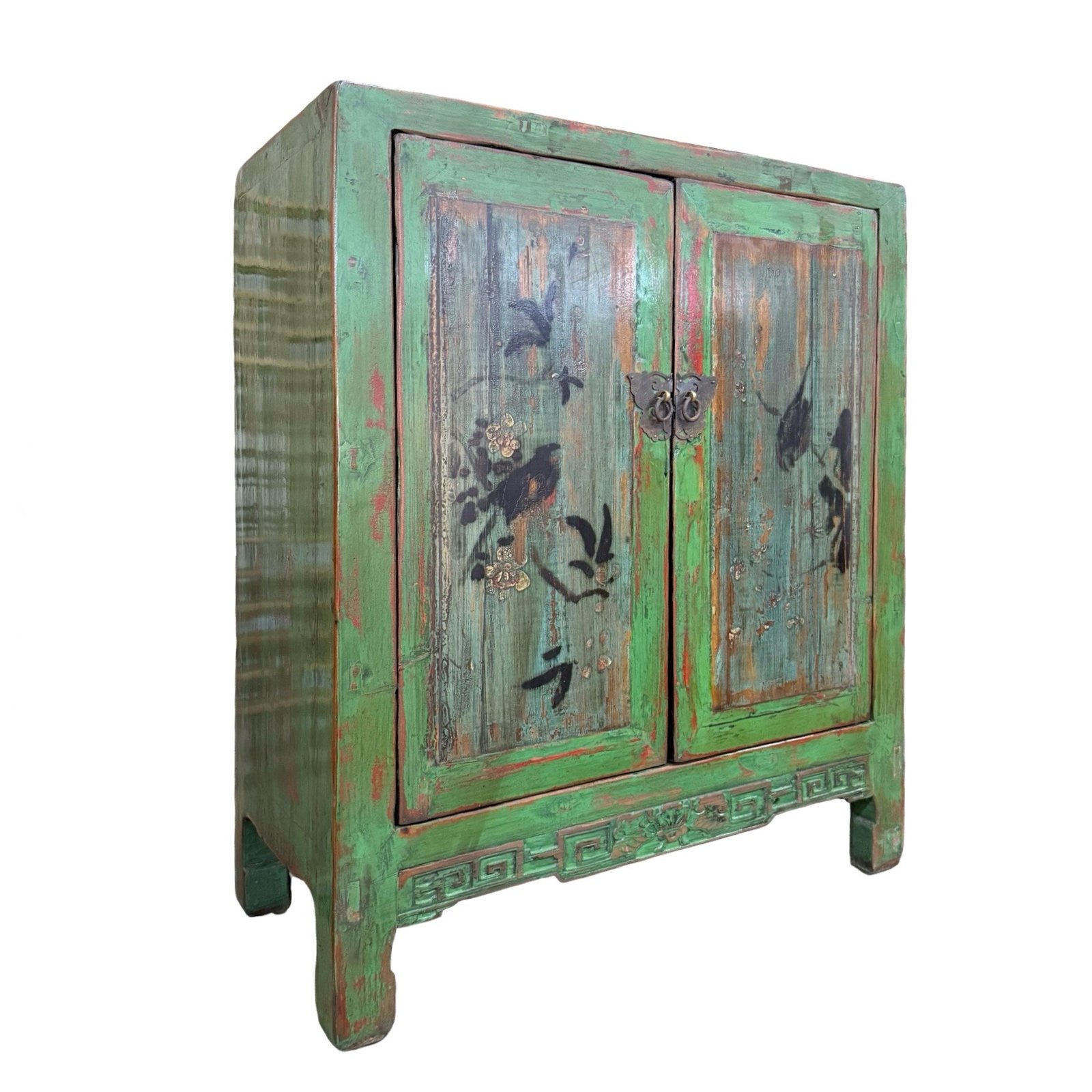 A small green vintage cabinet from Fujian, with paintings of birds and flowers on the doors. The cabinet has a nice relief carving at the bottom and subtle hoof feet. Approx. 60-80 years old.