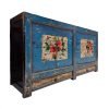 A vintage long sideboard from Gansu province, approximately 80–100 years old. Its striking blue finish is adorned with beautiful paintings of peonies and magpies, giving the piece a cheerful presence and making it a true statement piece.