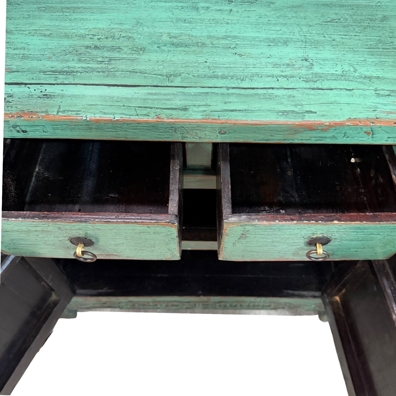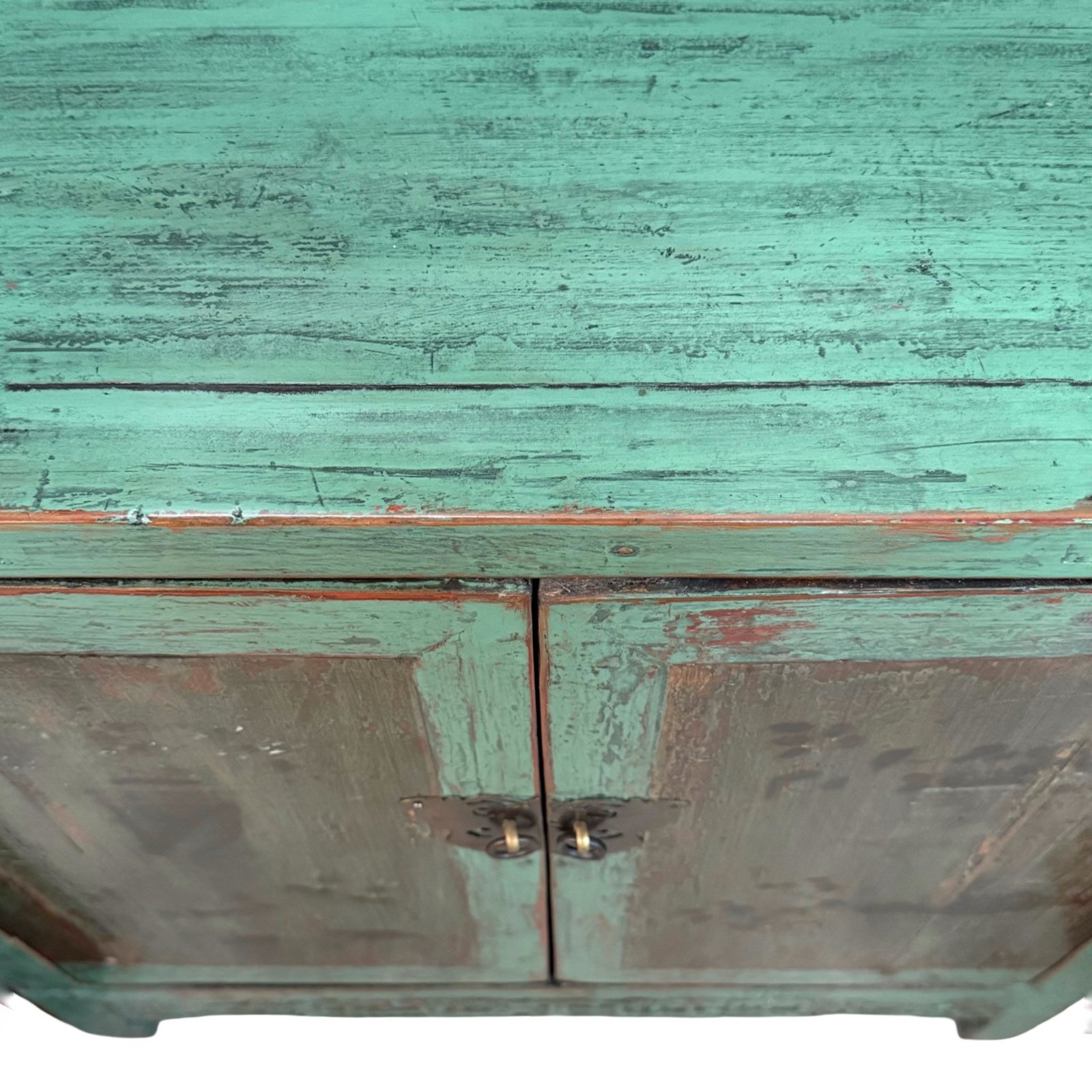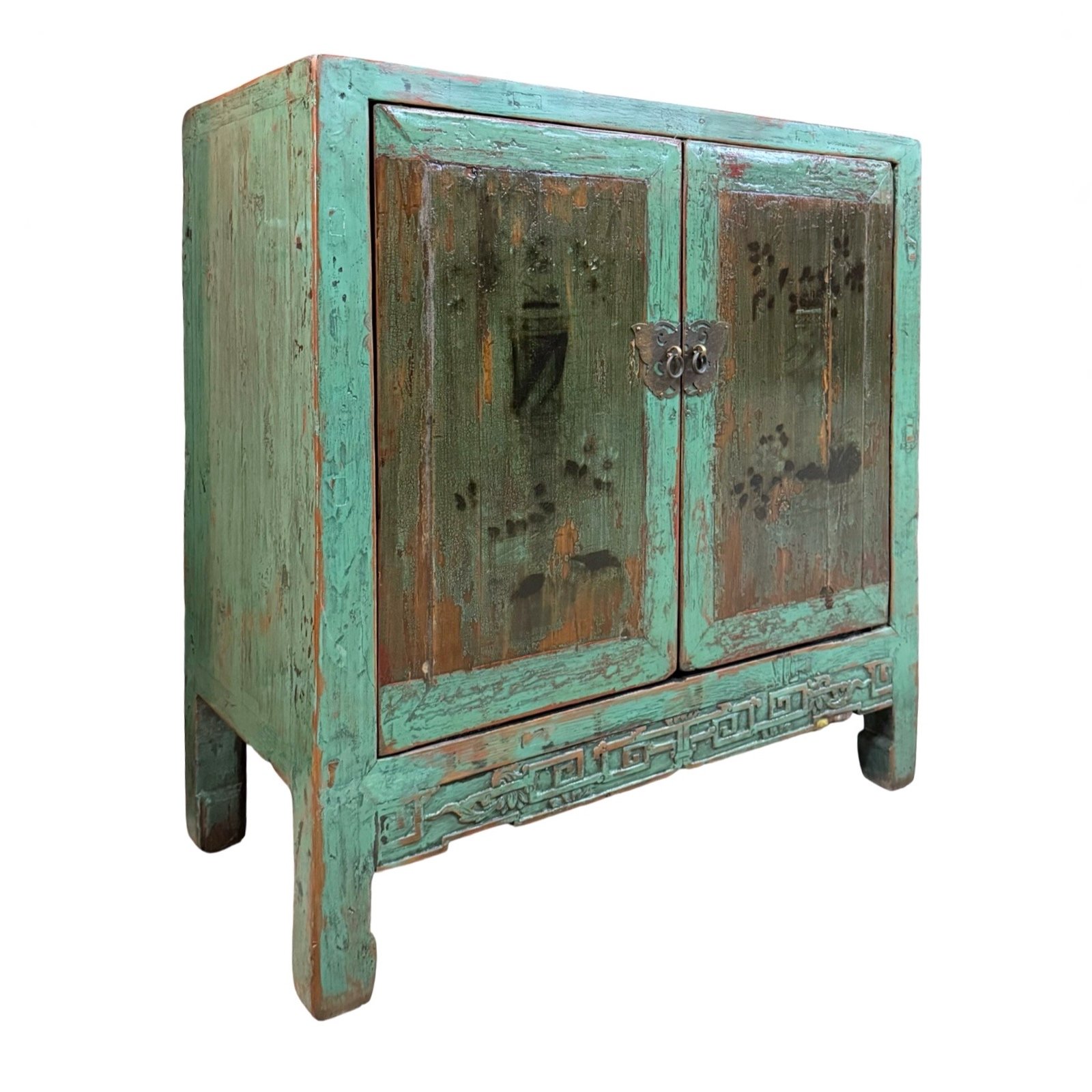 A vintage small cabinet from Fujian province. This is made of Pine wood, with hand-painted designs of flowers in vases on the doors. The turquoise colour is a new colour that had been repainted on, but the painting on the doors were kept original. A semi-matte clear lacquer had been applied to protect the overall finish.