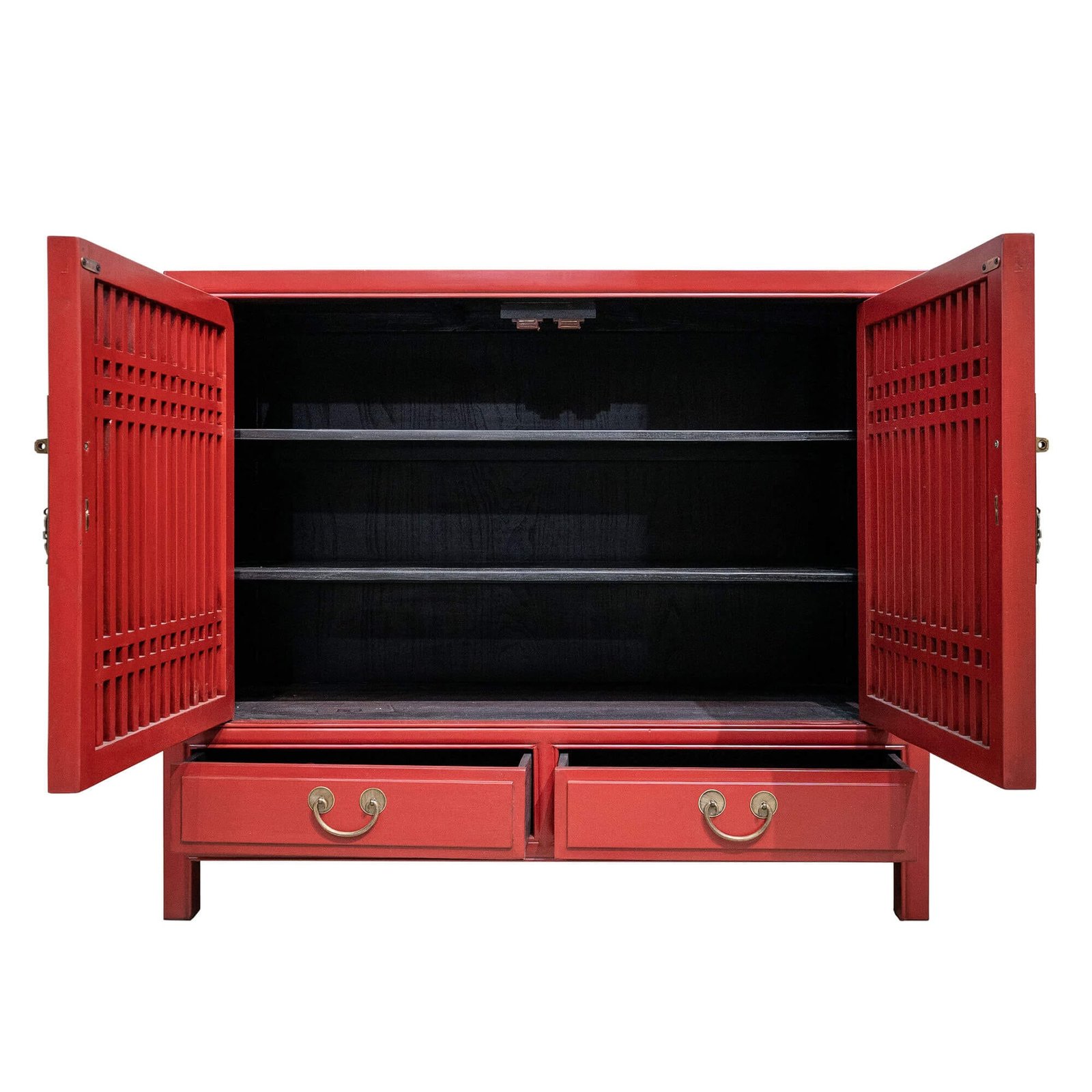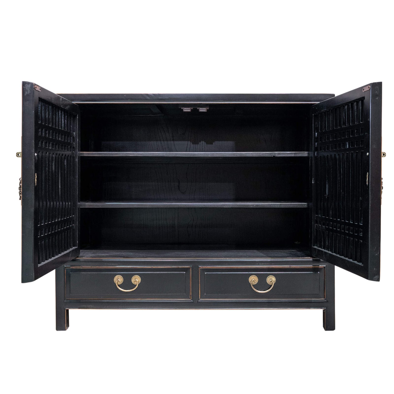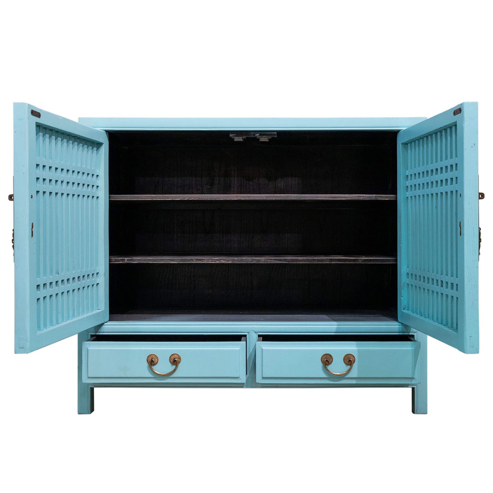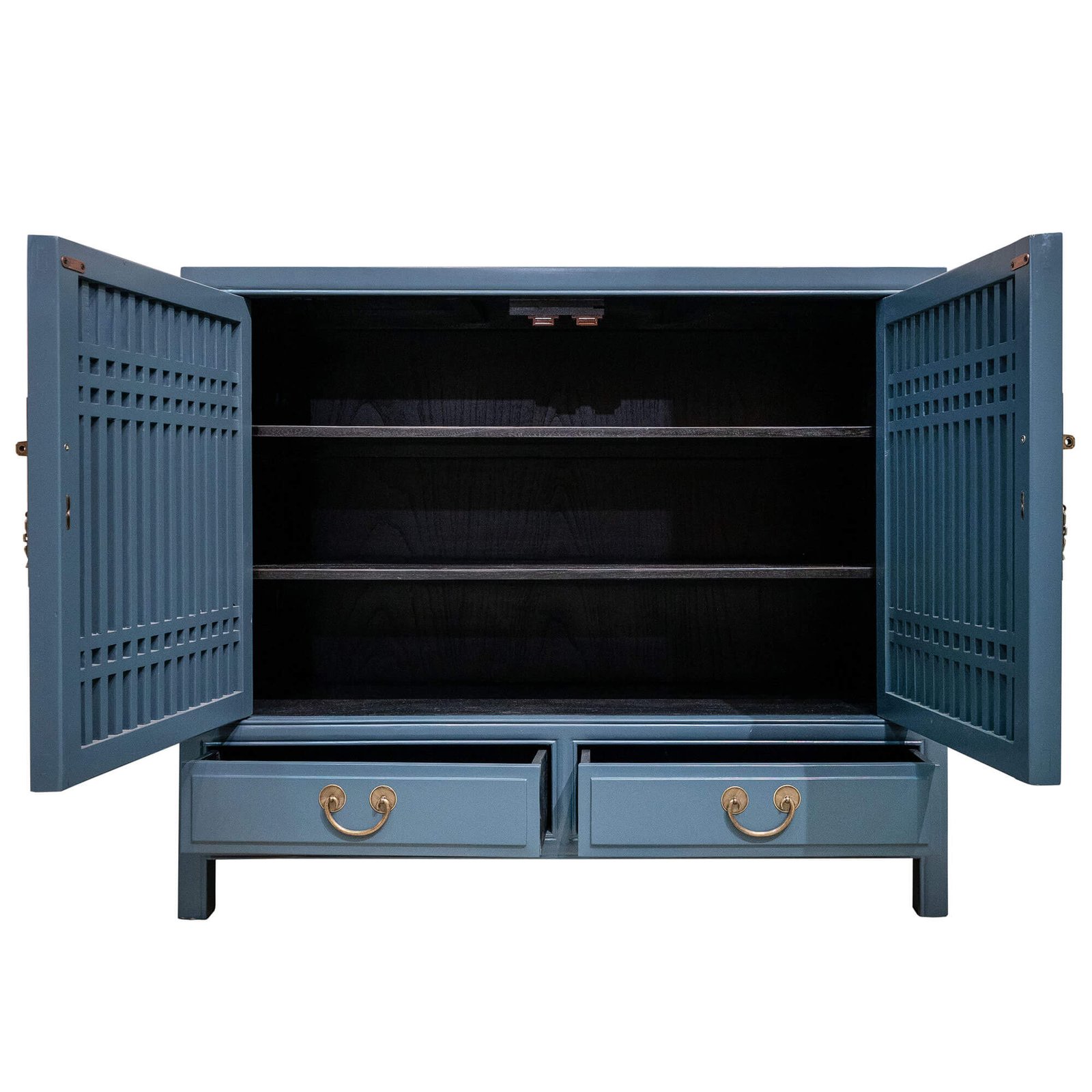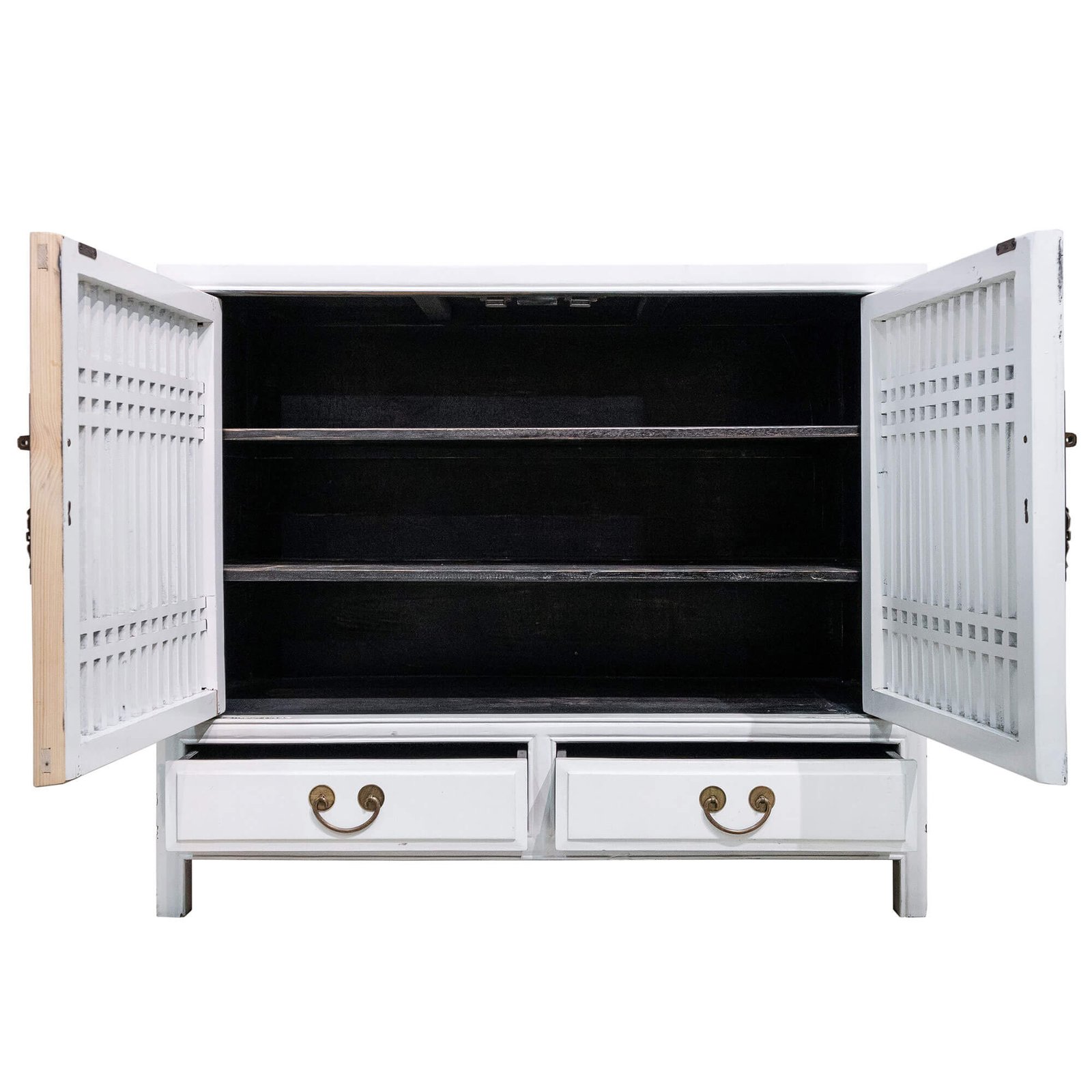 Wooden double door cabinet with slatted doors and 3 levels of shelving inside. Shelves are removable but not adjustable.
