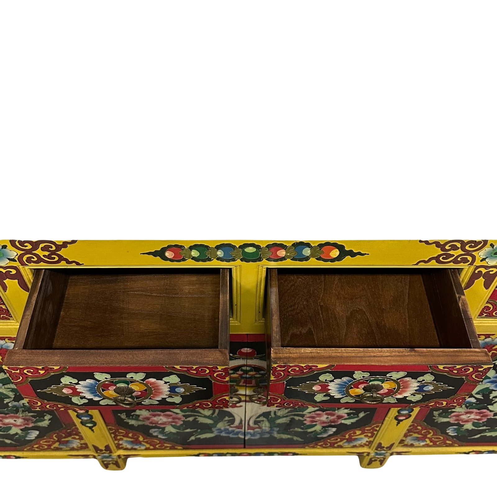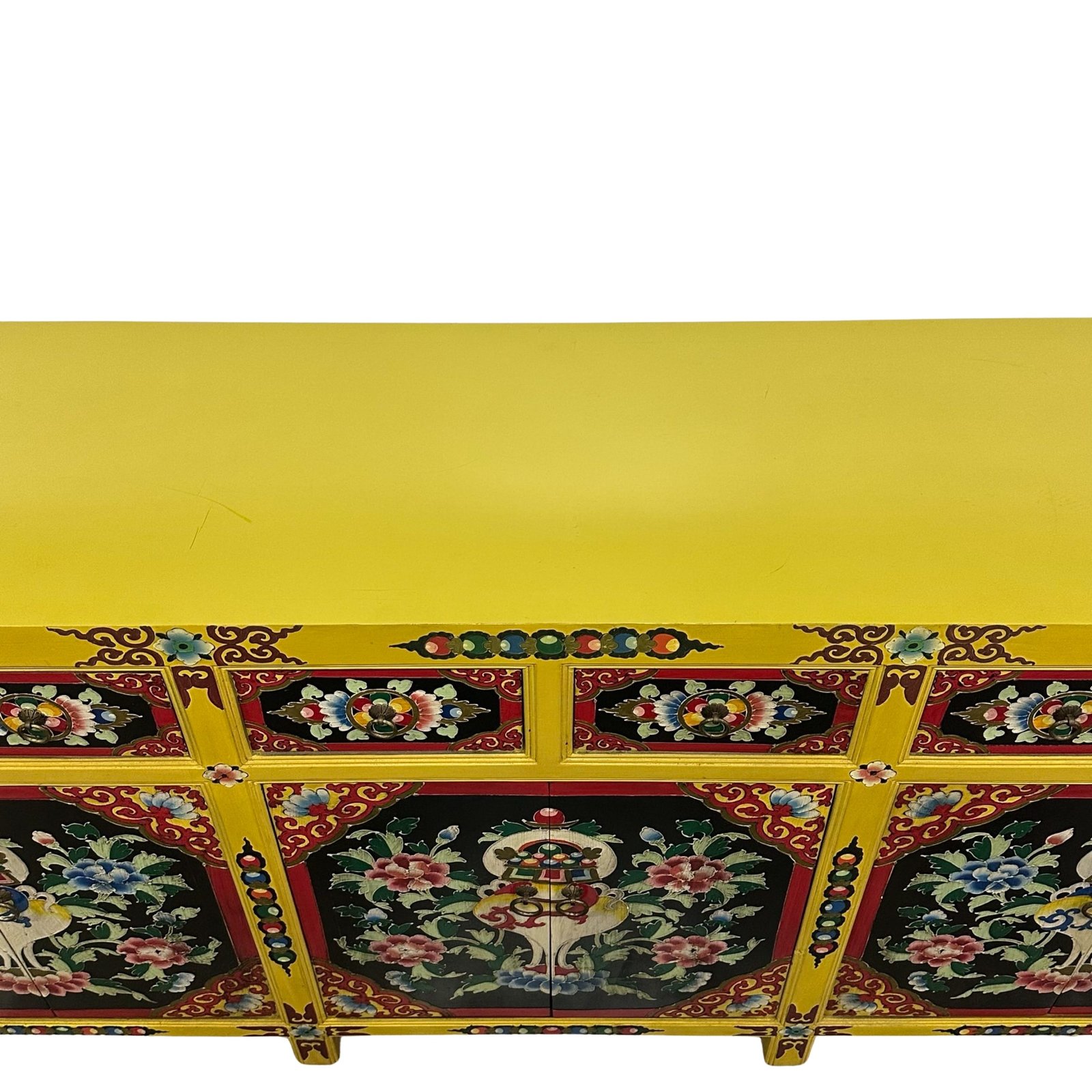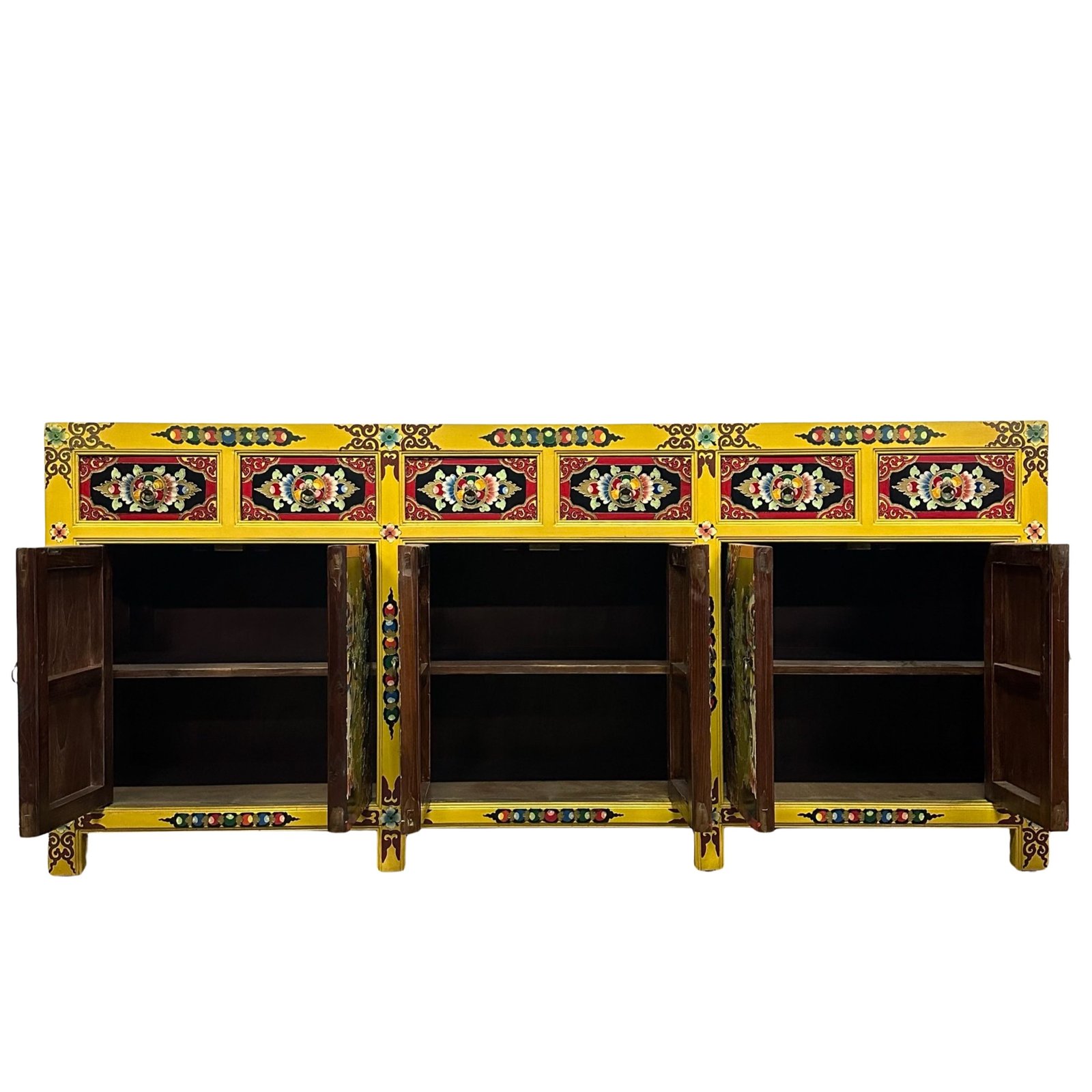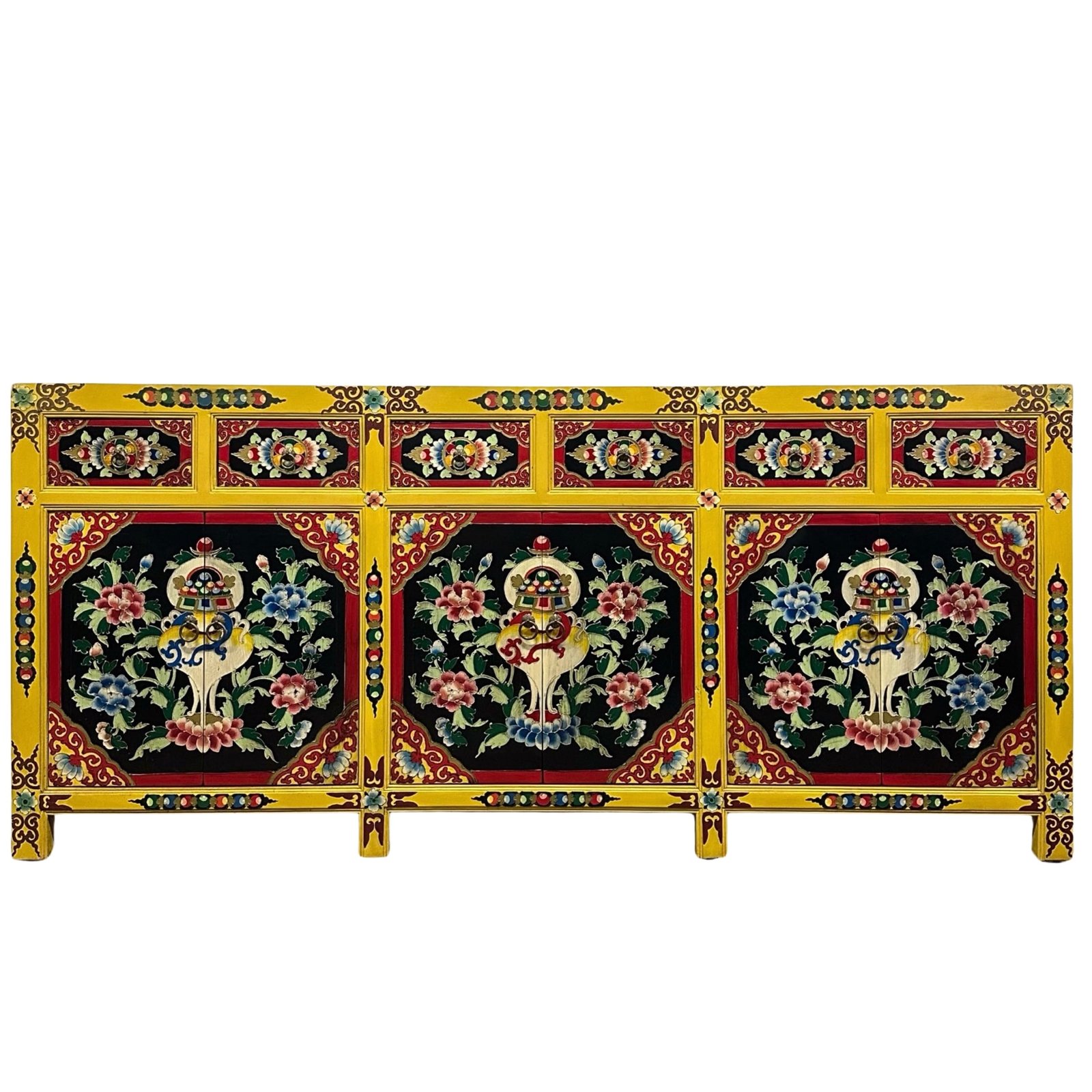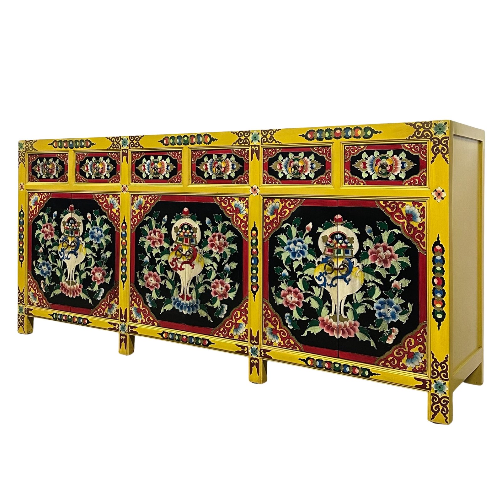 A long sideboard in yellow & black, with hand-painted Tibetan-style motifs of flowers and conch.