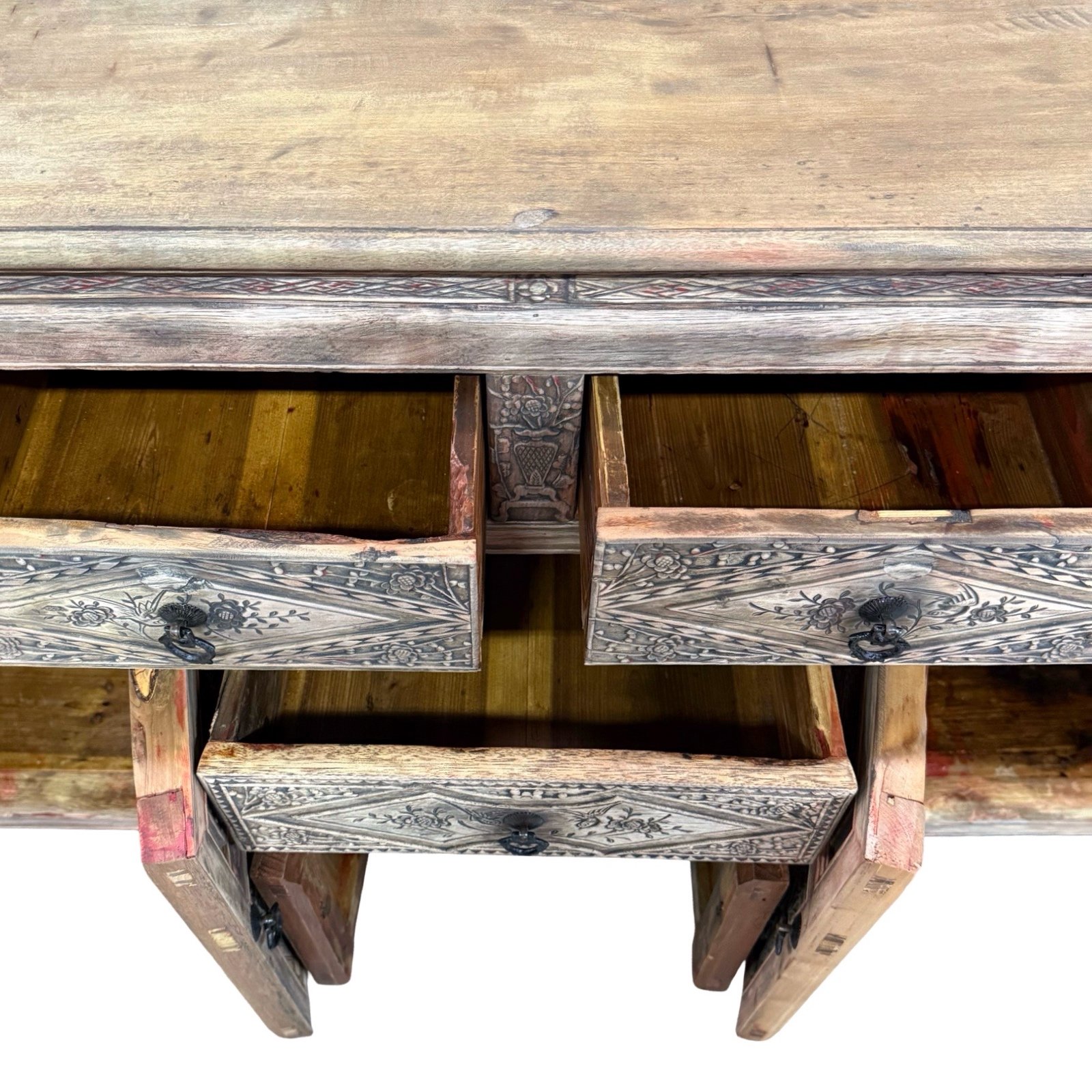 This vintage carved sideboard from Fujian province is approximately 80-100 years old. Originally finished in red and gold, the paintwork had suffered considerable damage over time. We carefully removed the old paint to reveal the beautiful natural wood beneath—a transformation that allows the intricate floral carvings to truly shine with remarkable clarity and depth.