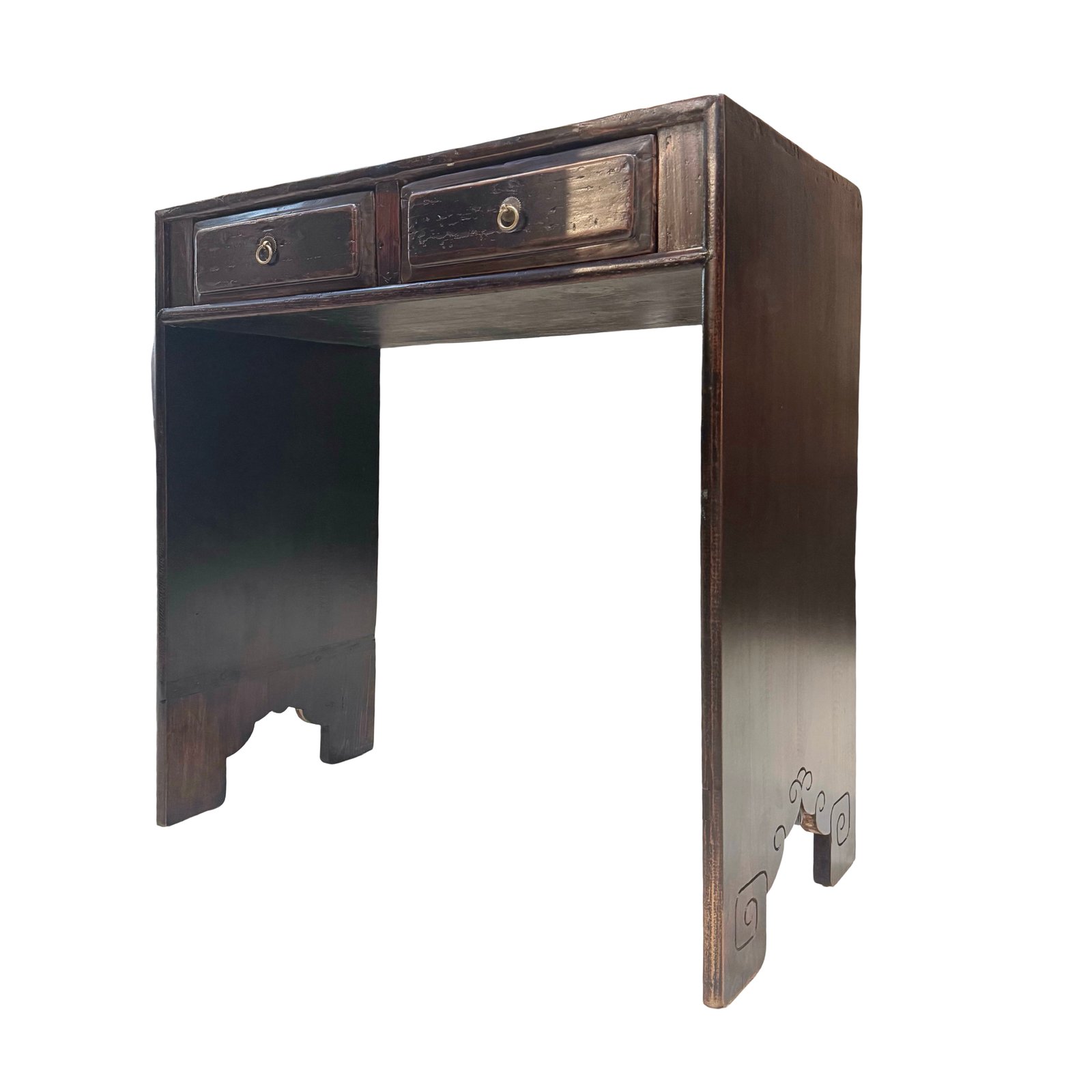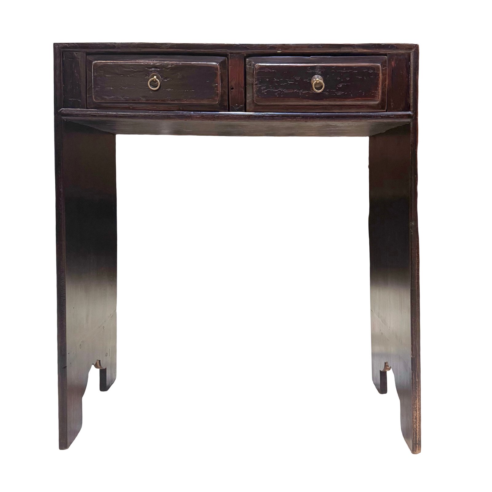 A charming 2-drawer table from Fujian province, approx. 80-100 years old. This table features an unusual design with wide side planks instead of traditional legs, a unique & eye-catching piece.