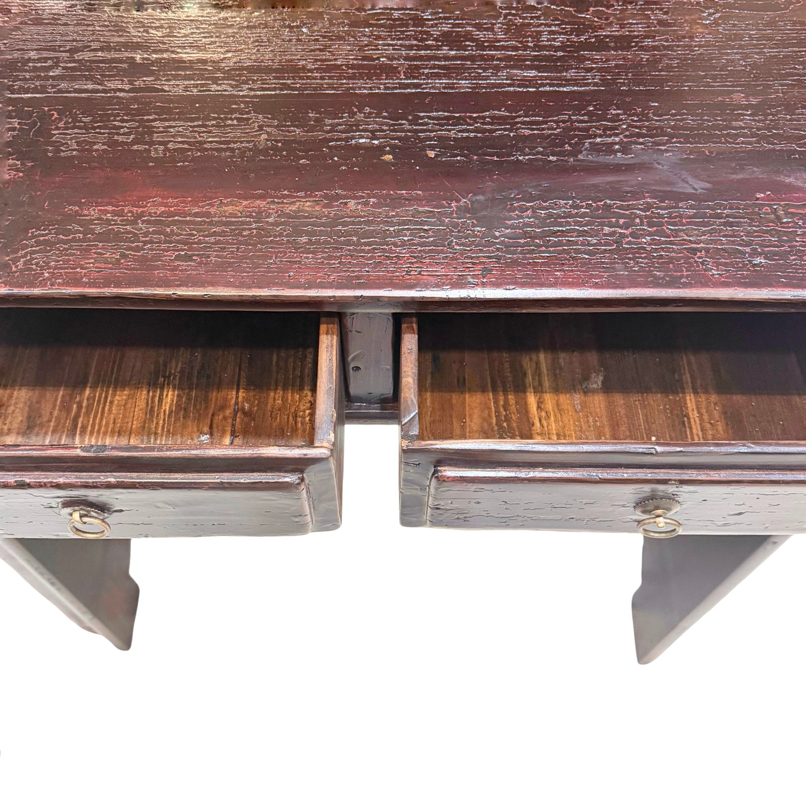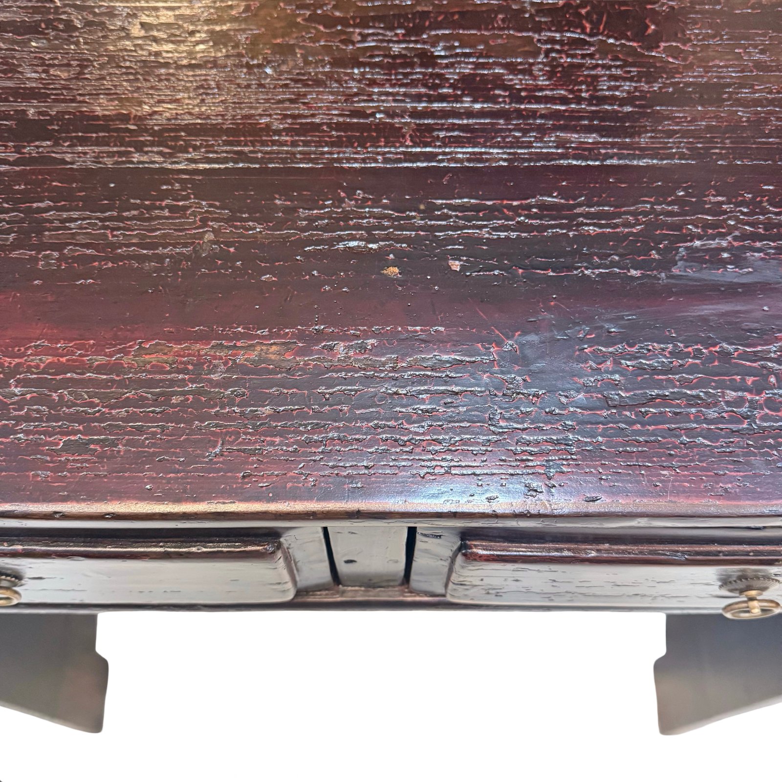 The table has a very deep reddish black colour, and the lacquer on top has a lot of crackling, giving it character.