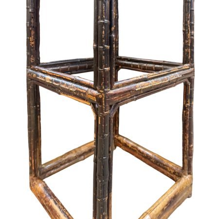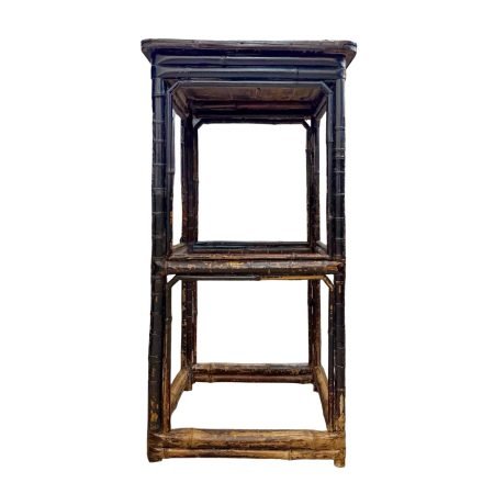 This piece features the more refined construction method where the legs are made by binding several bamboo pieces together, rather than using one thicker growth. The horizontal surface is finished with black lacquer.