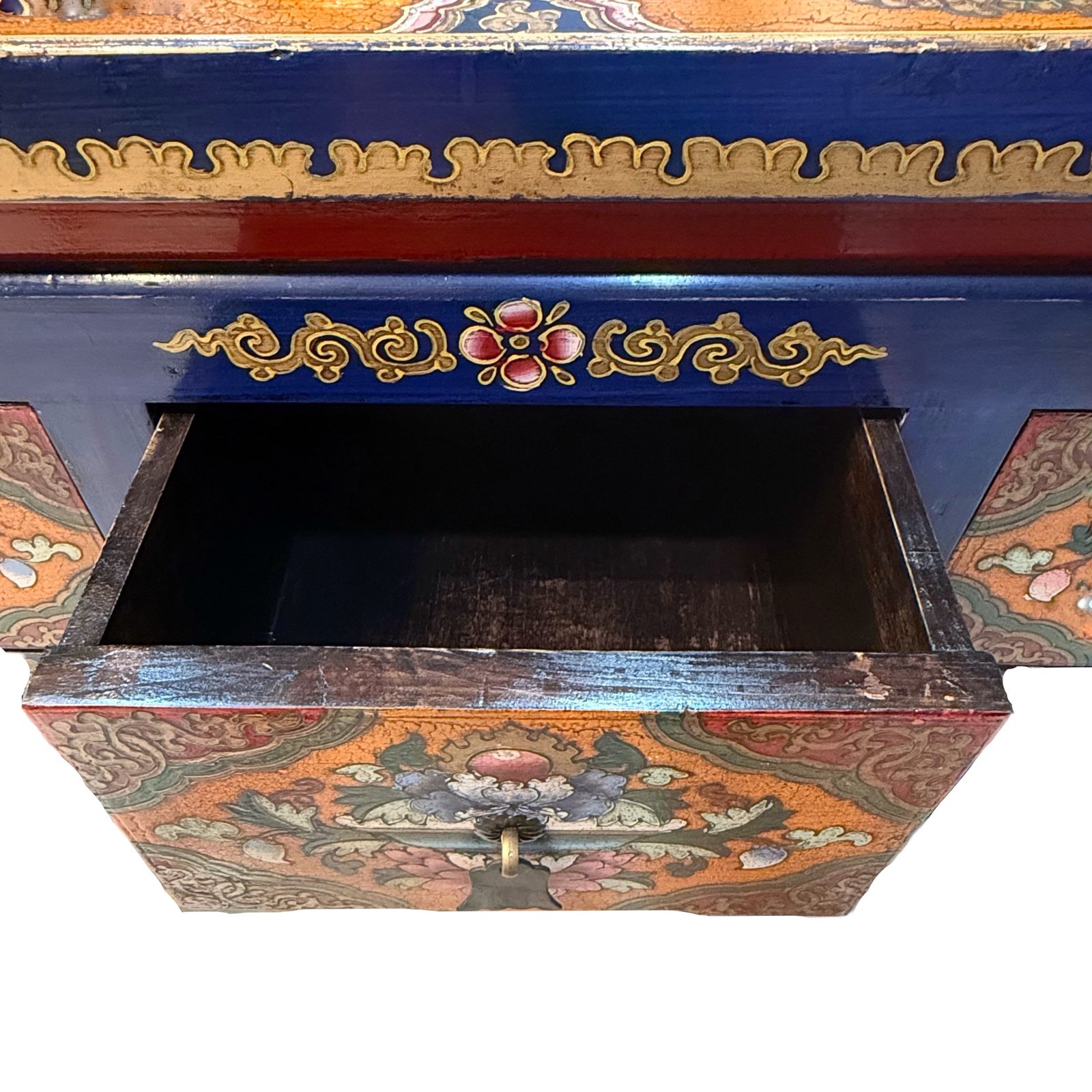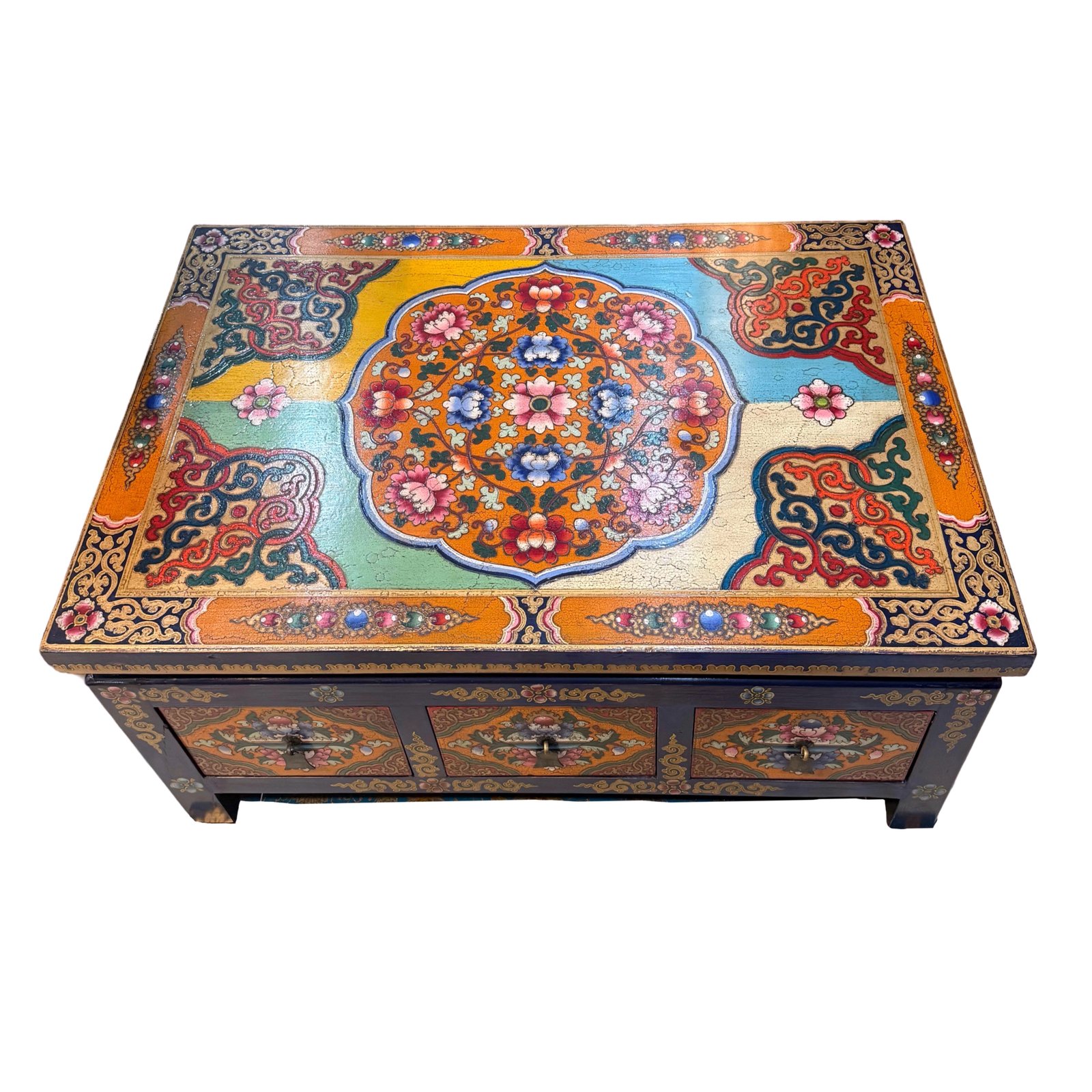 A rectangular coffee table hand-painted in Tibetan-style in beautiful colours of burnt orange and navy blue. There are 6 drawers in total, 3 on each side.