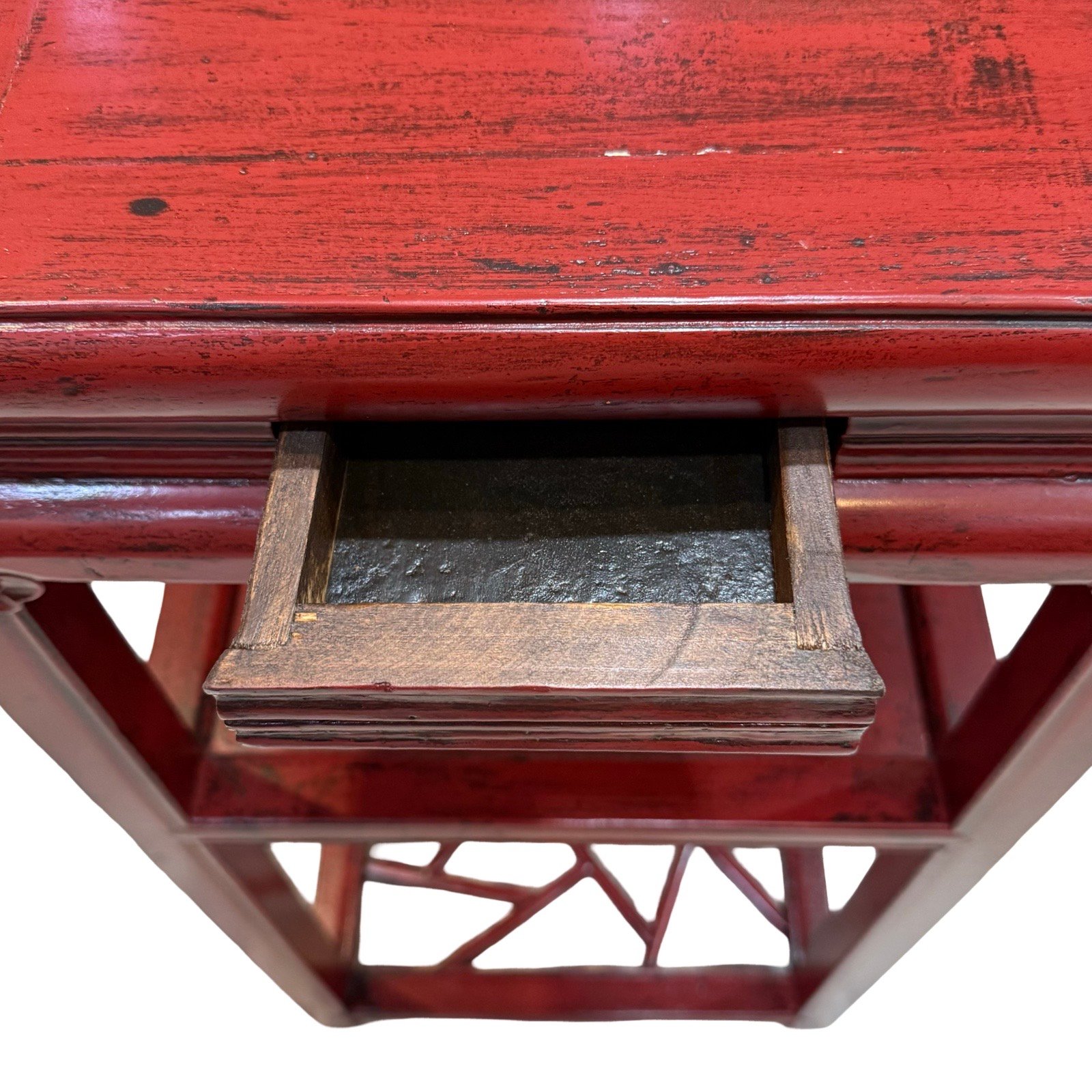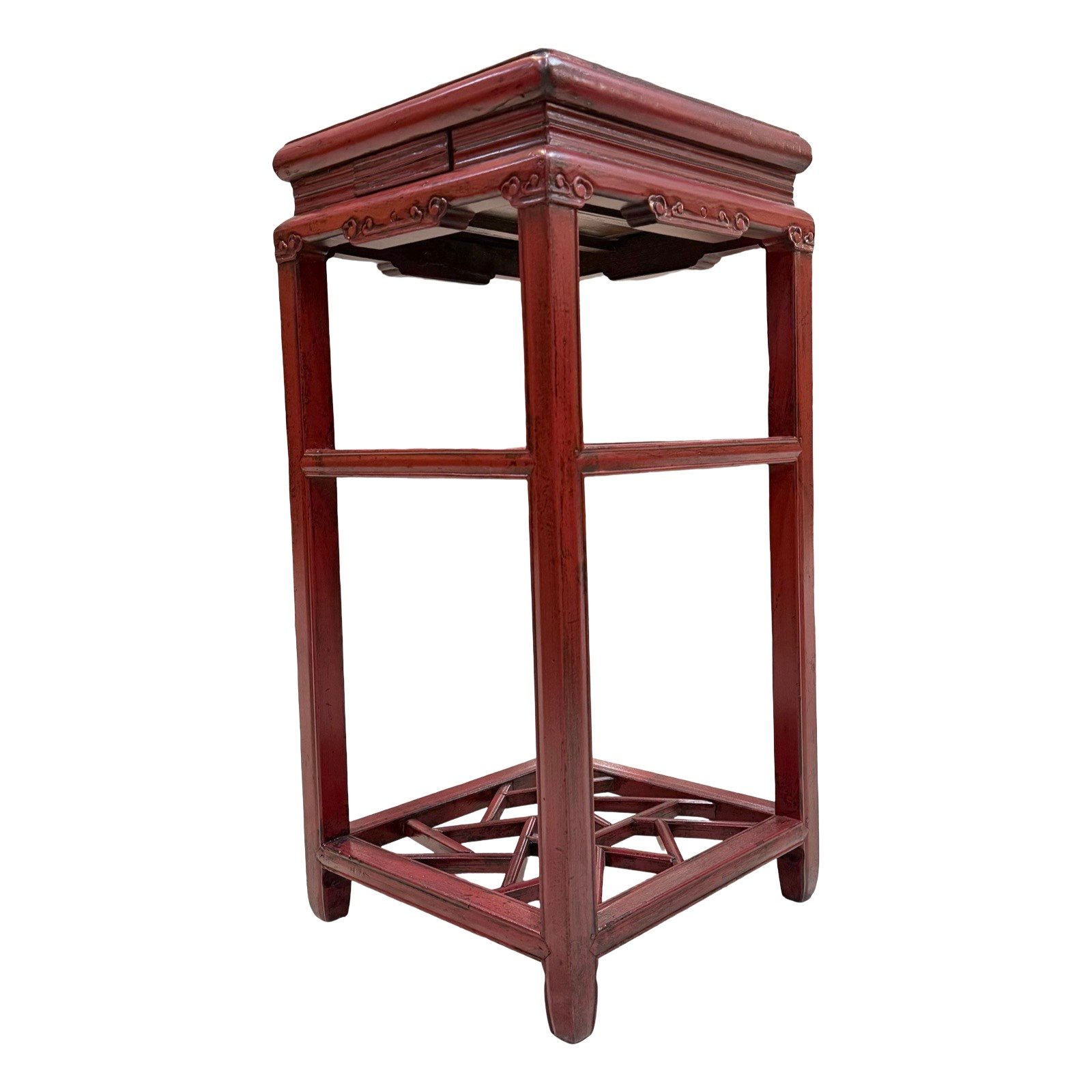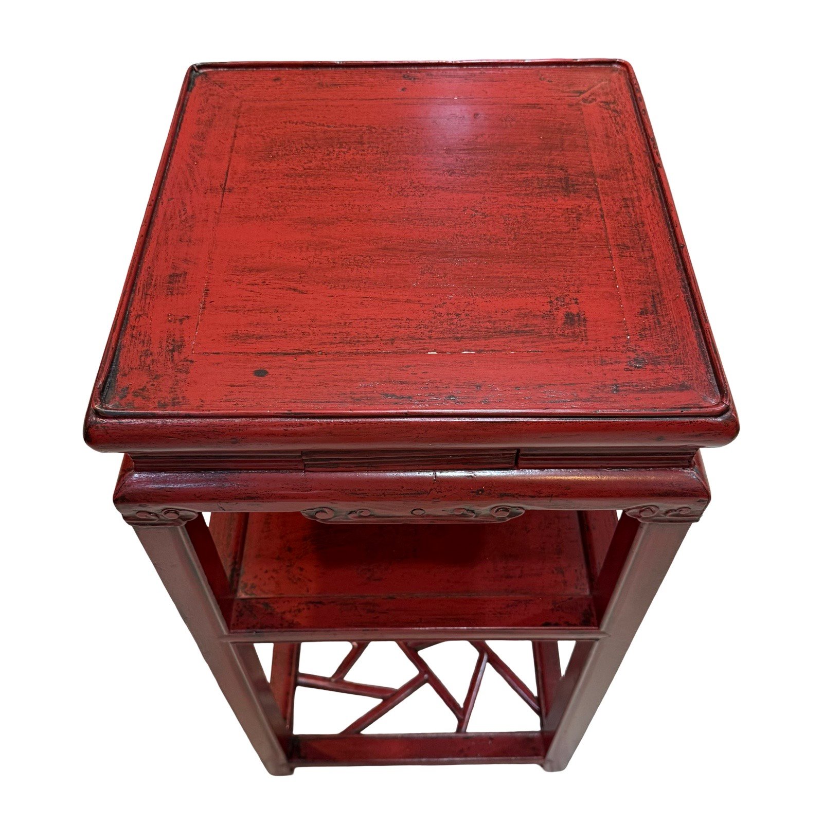 An old square tea table from Zhejiang province, with a middle shelf and “cracked ice” lattice base, approx.80-100 years old. This table has delicate carved details around the sides and corners and a small “hidden” drawer.