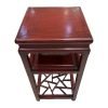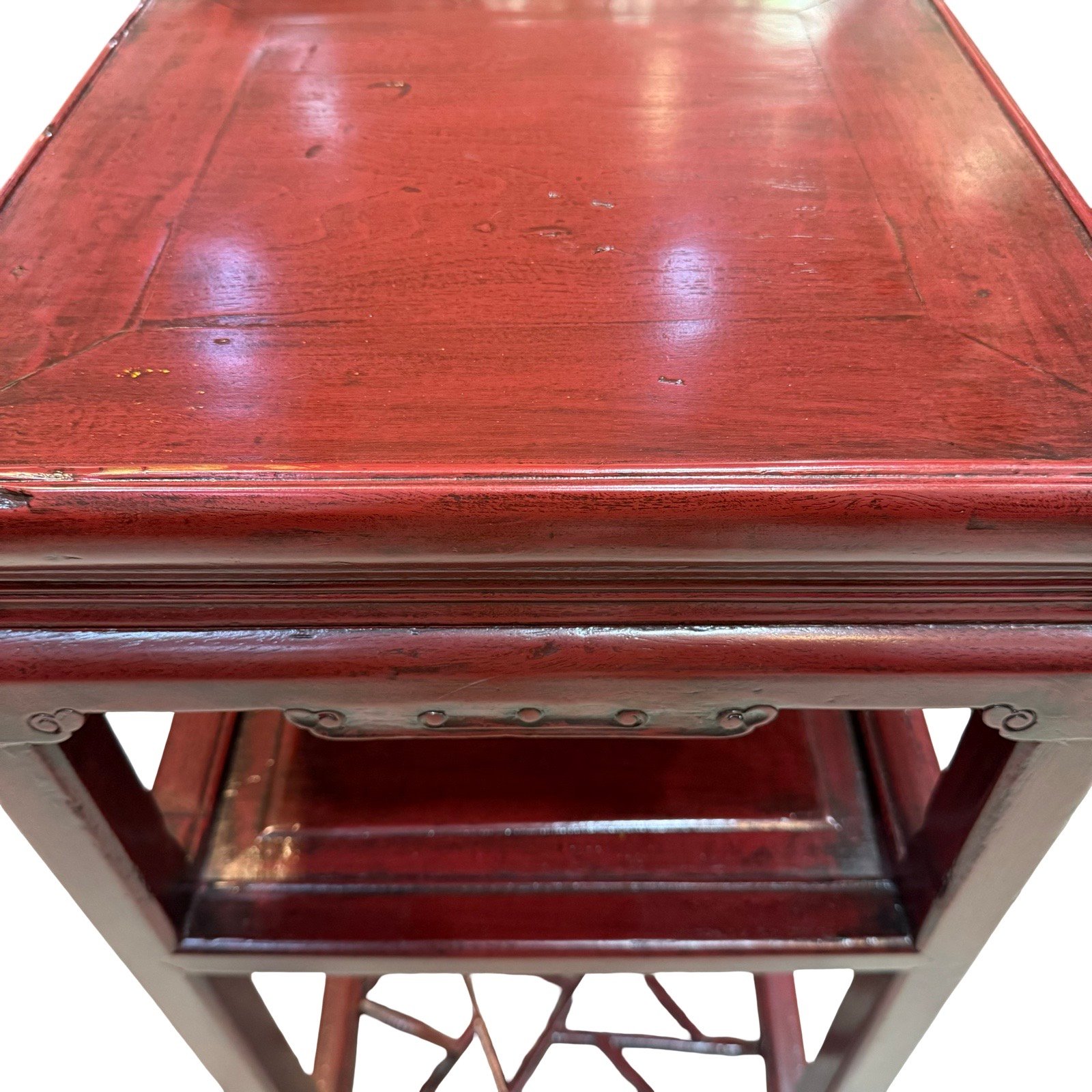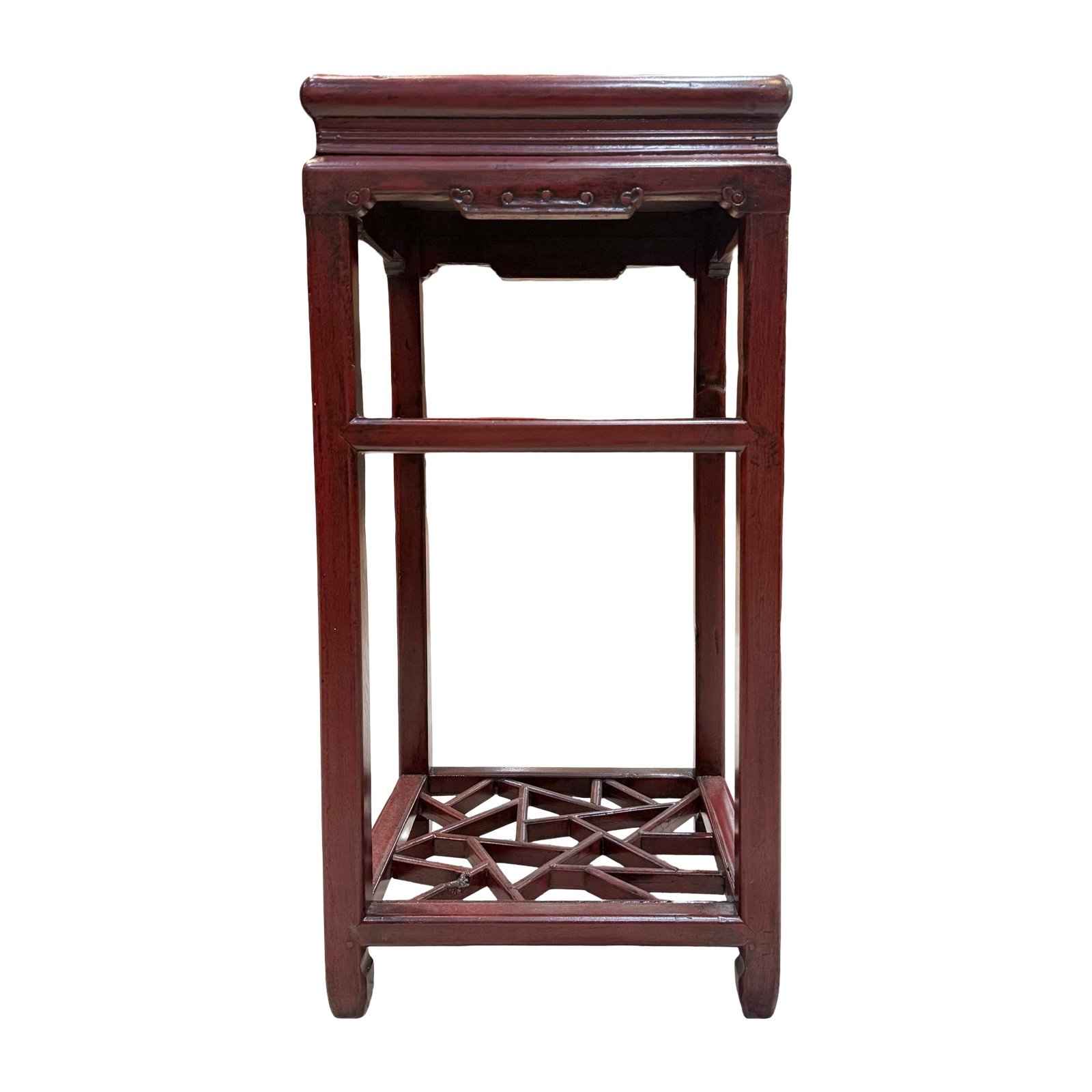 An old square tea table from Zhejiang province, with a middle shelf and “cracked ice” lattice base, approx.80-100 years old. This table has delicate carved details around the sides and corners, and subtle hoof feet.
