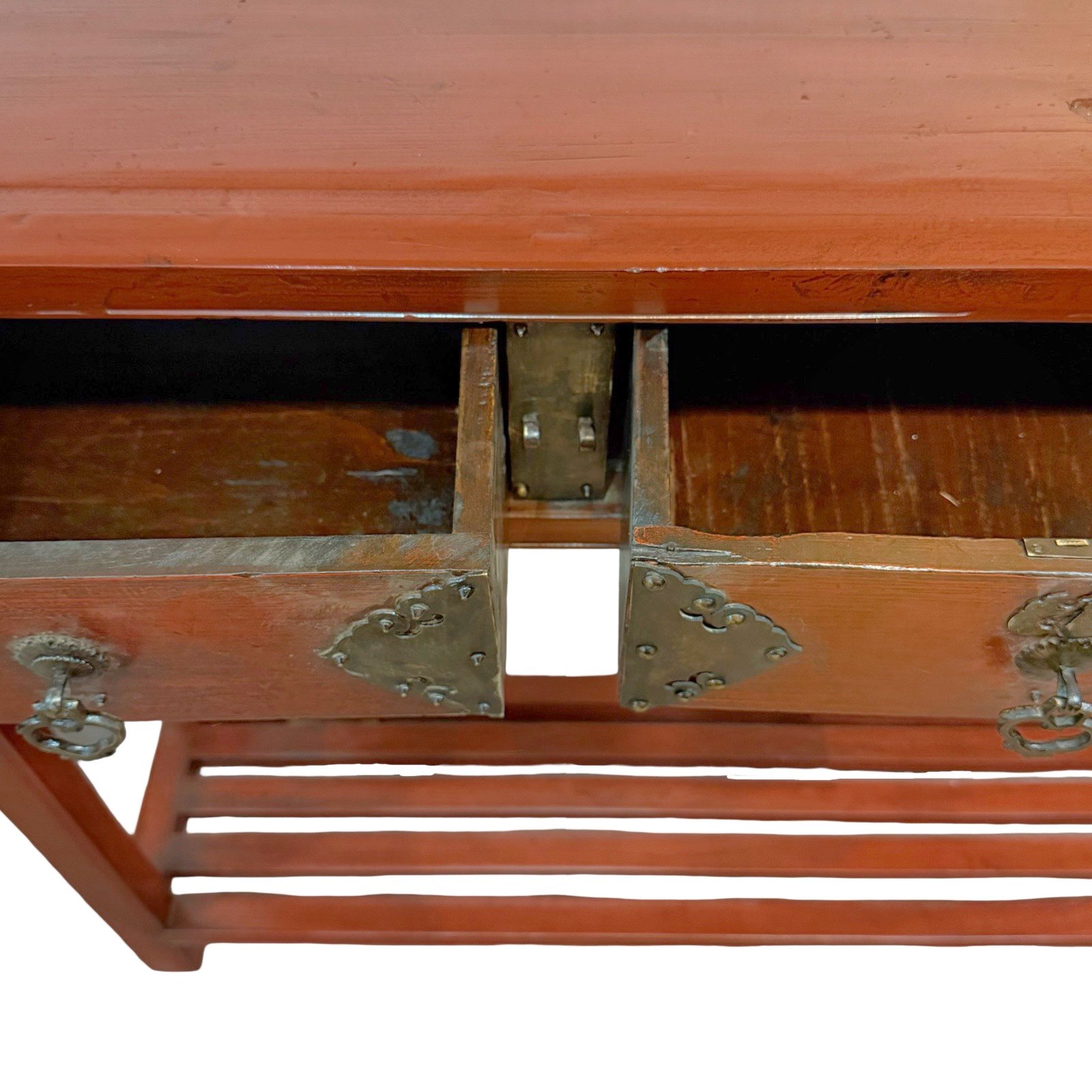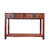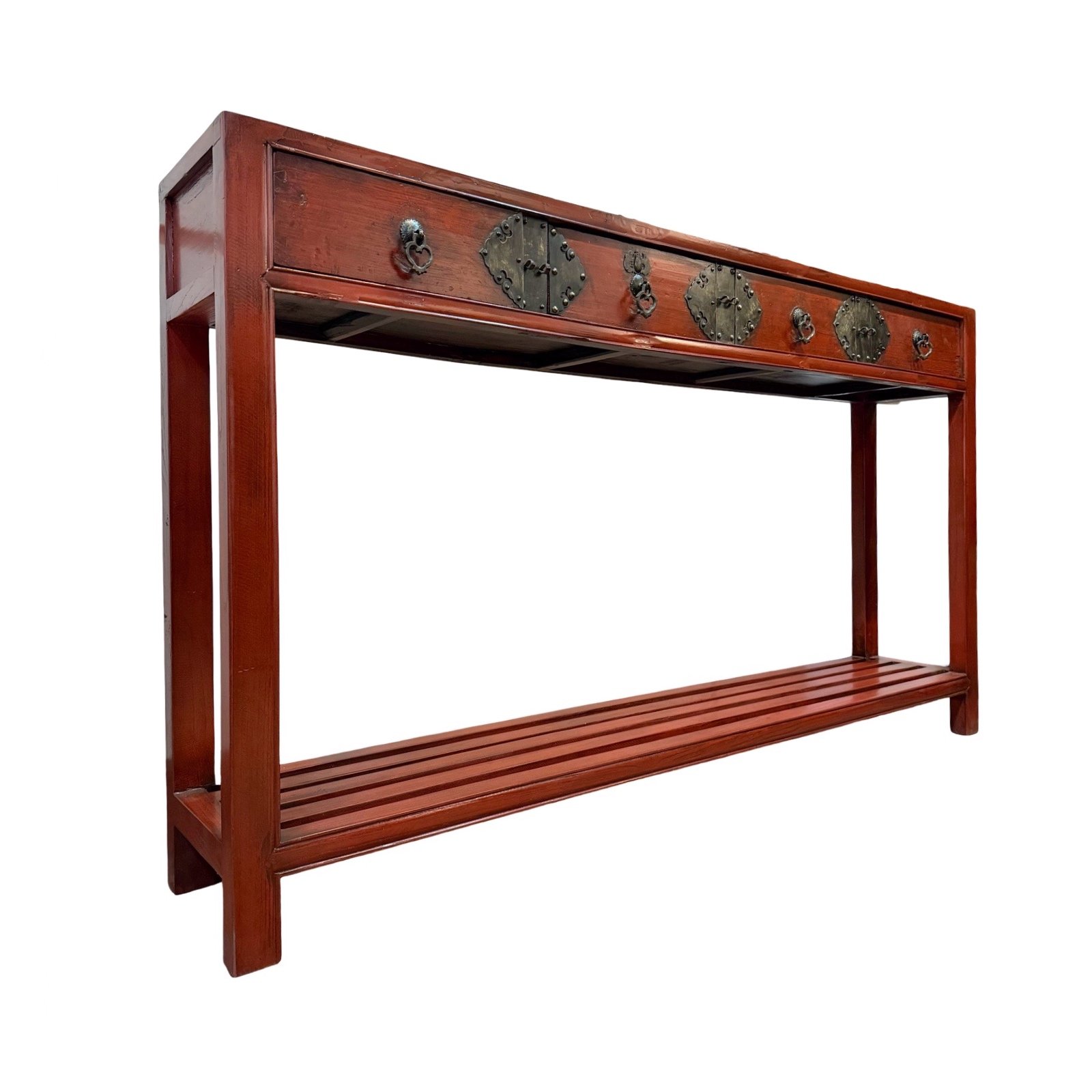 A long, slim console from Fujian province, finished in a rich red lacquer, approximately 80–100 years.