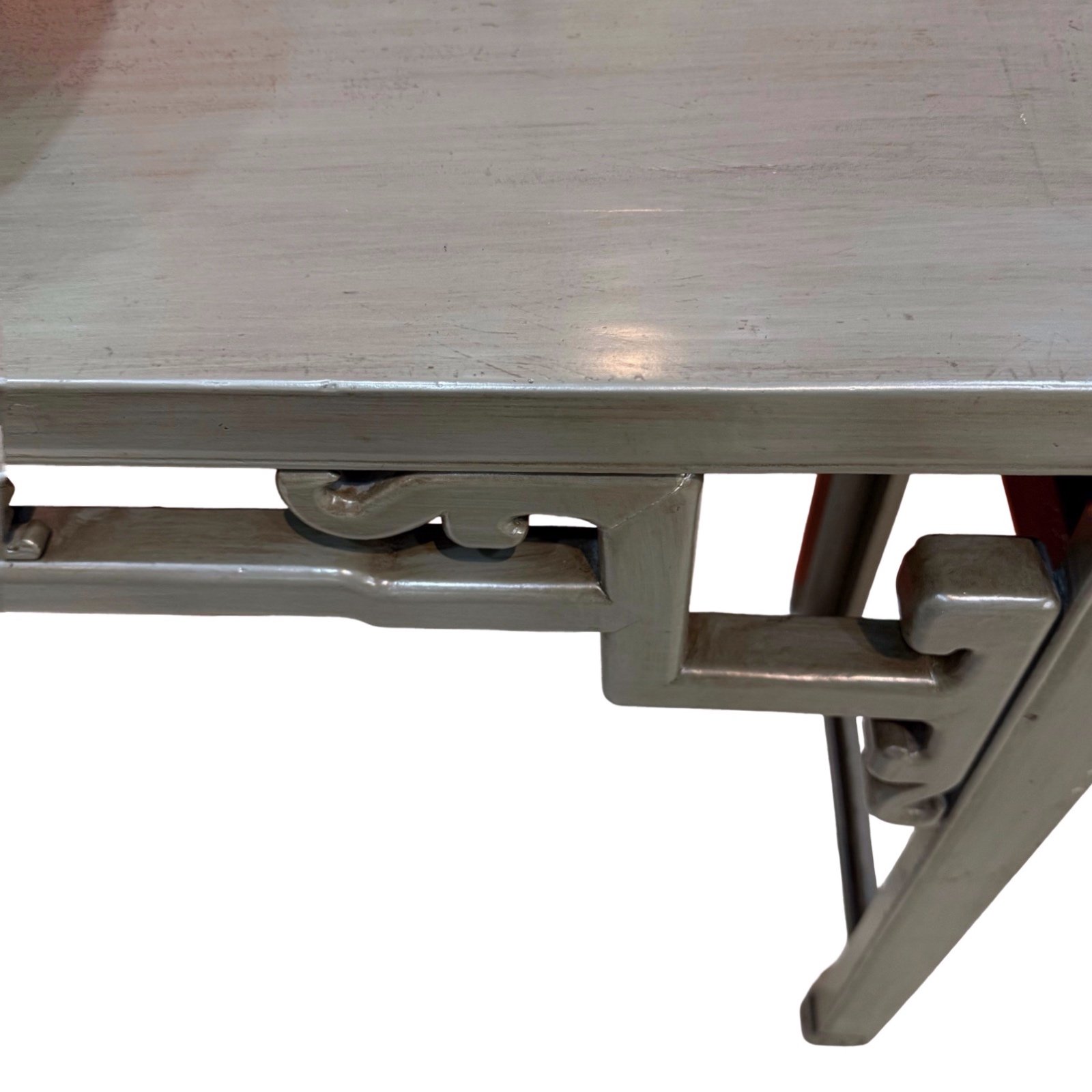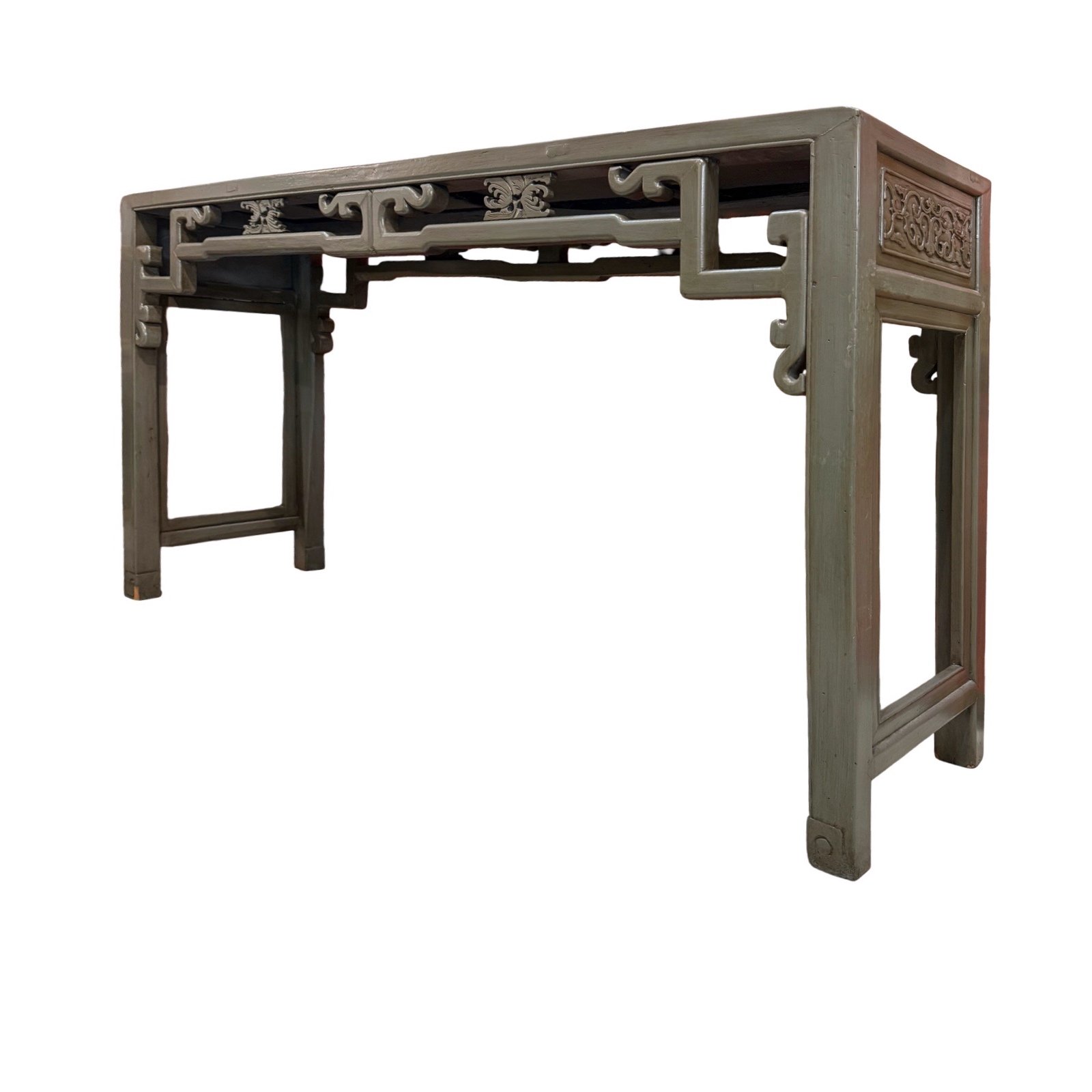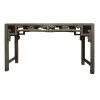 Originally from Zhejiang, this vintage console table has been refinished in a distressed grey. The struts beneath the tabletop feature hand-carved Buddha’s hand citron fruits, a traditional symbol of good luck. This table has subtle scroll details at the feet.